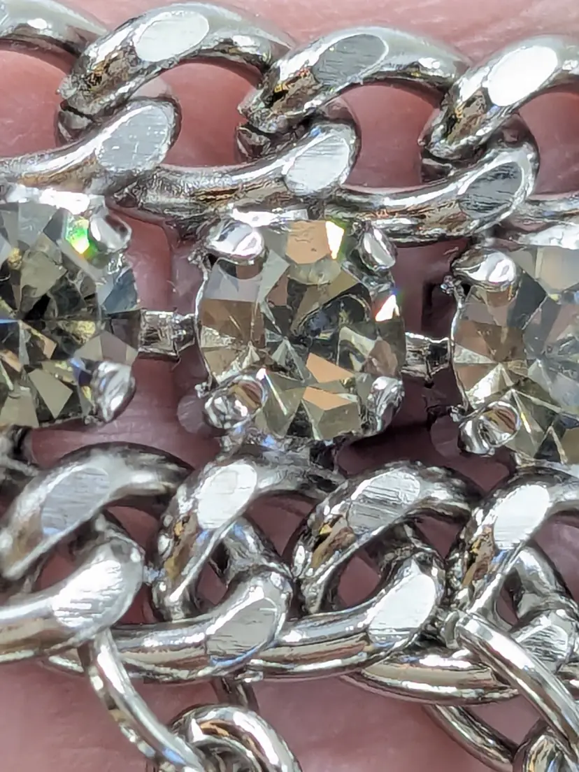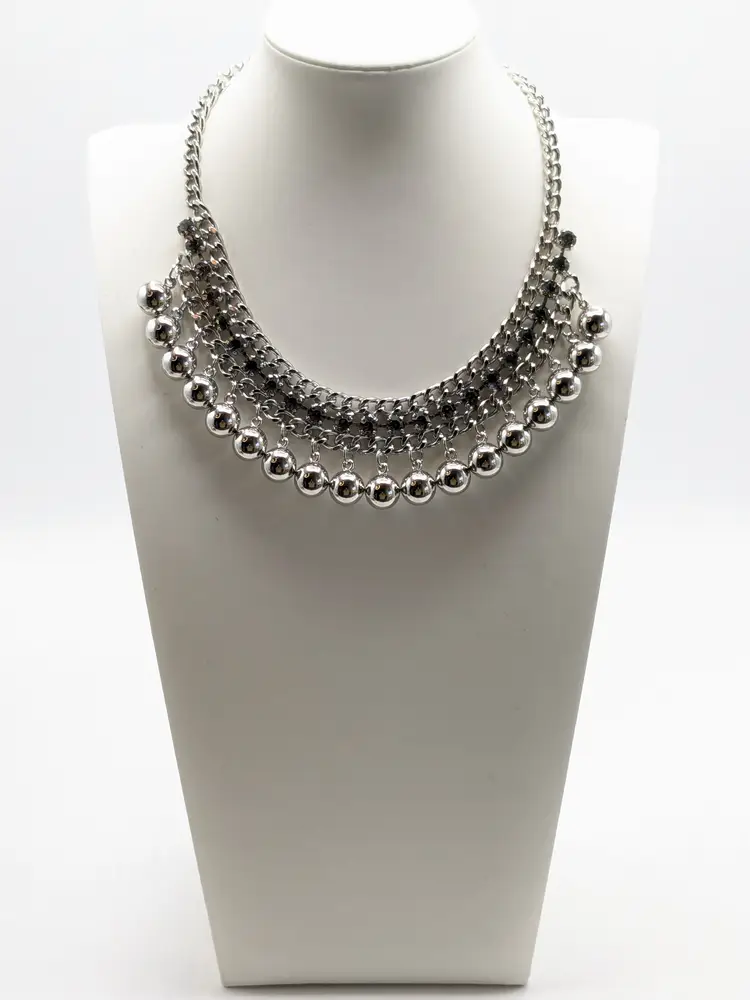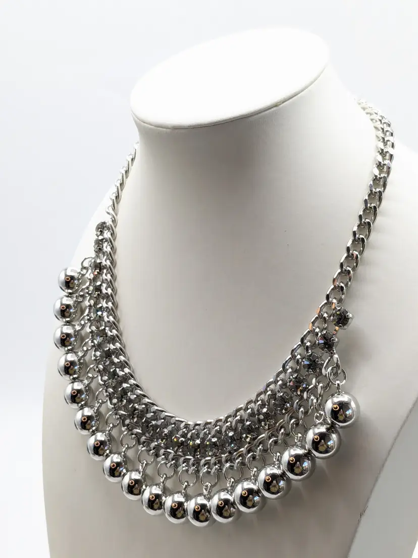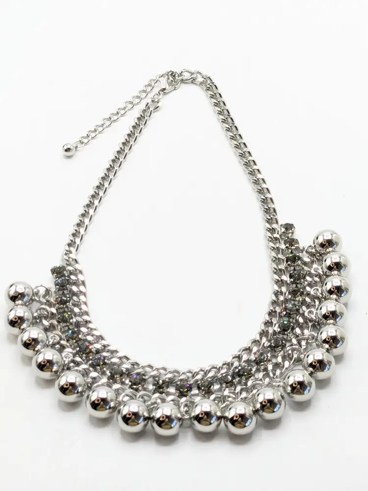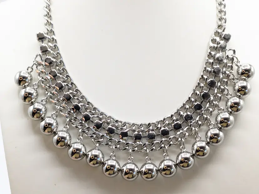 Good condition. Silver tone is bright and shiny with no color loss. Features prong set rhinestones and dangle/drop balls. Measures 16" with a 3" extension. Drop is 1 1/2". wen