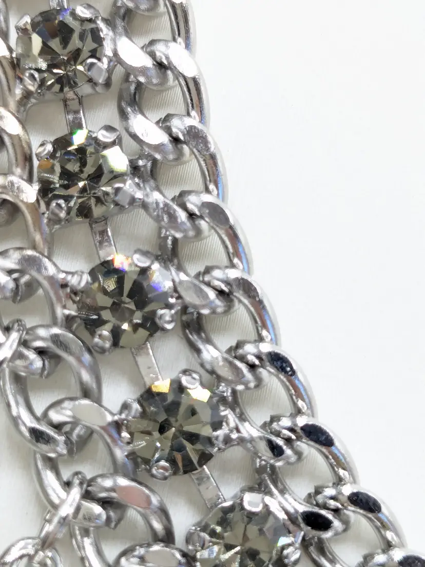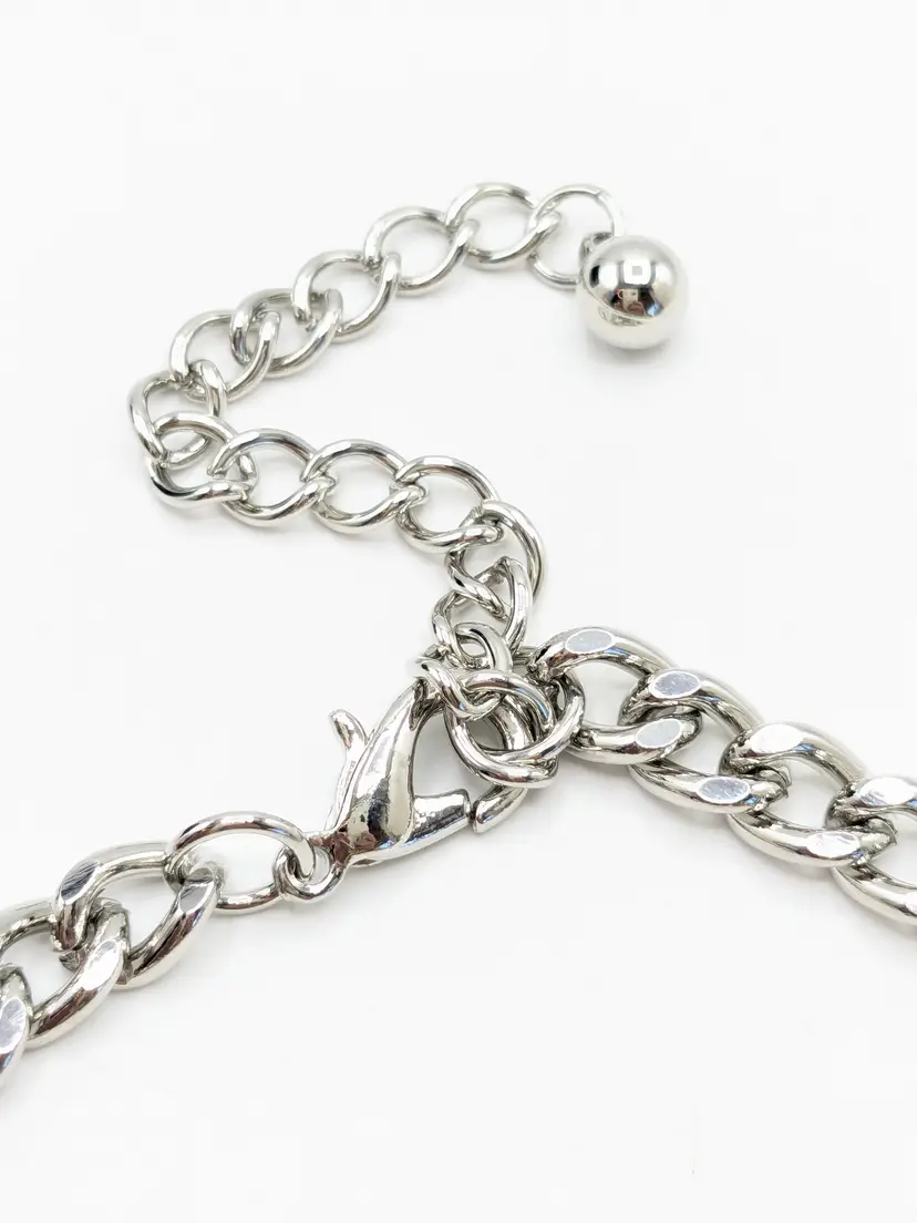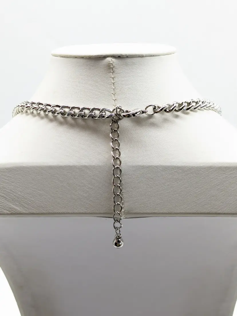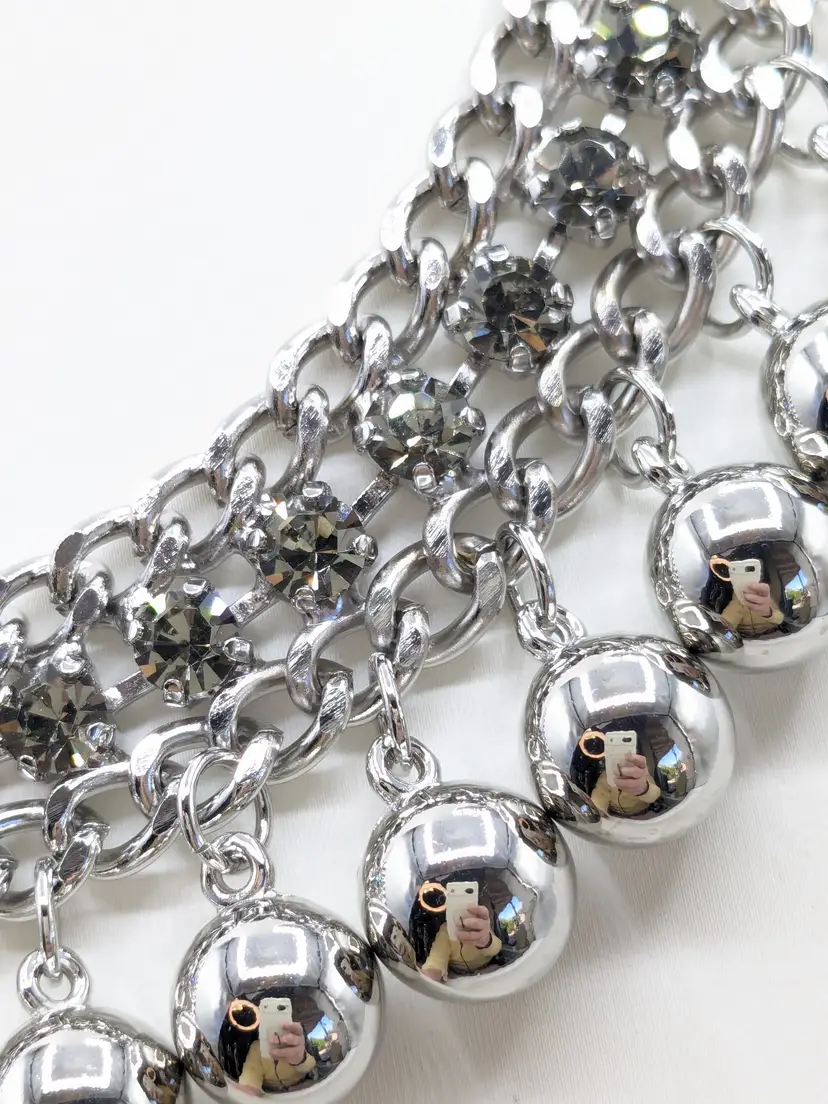 Good condition. Silver tone is bright and shiny with no color loss. Features prong set rhinestones and dangle/drop balls. Measures 16" with a 3" extension. Drop is 1 1/2". wen