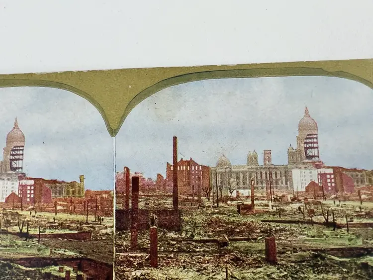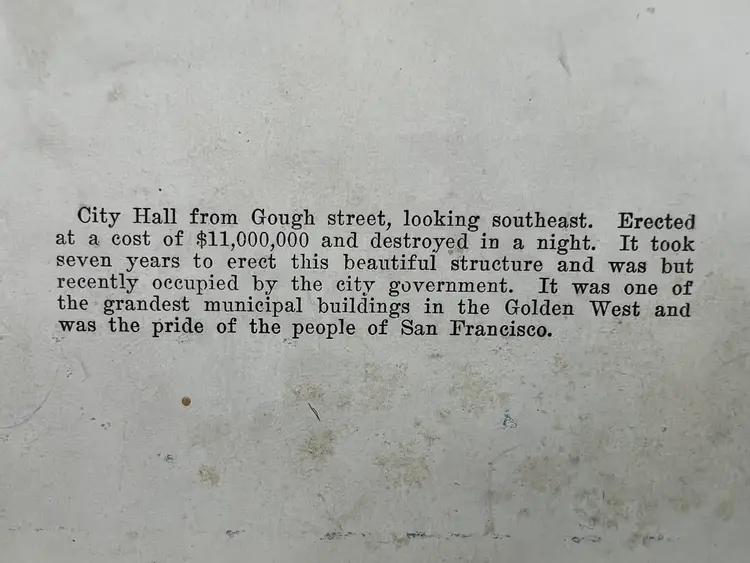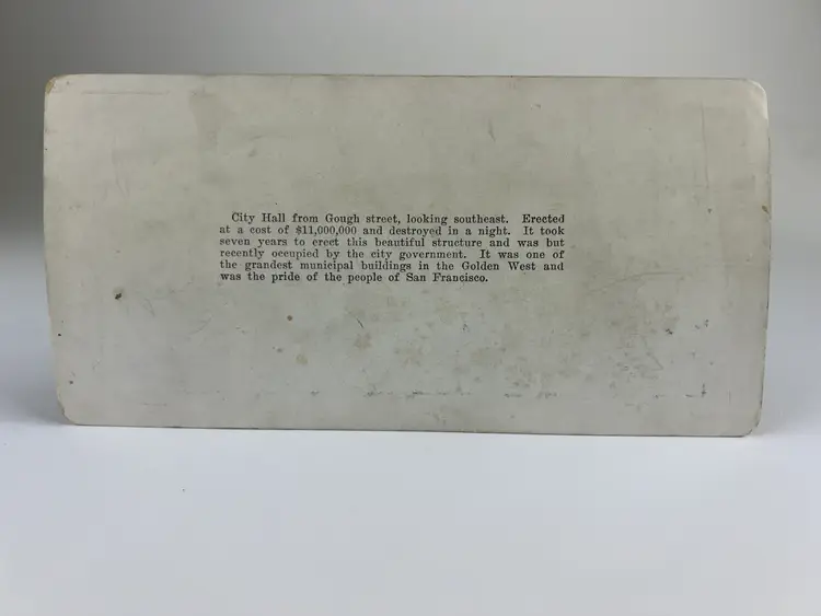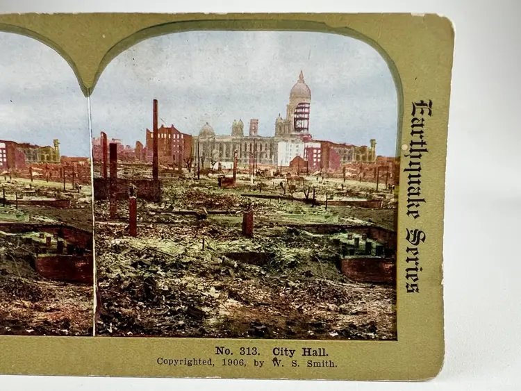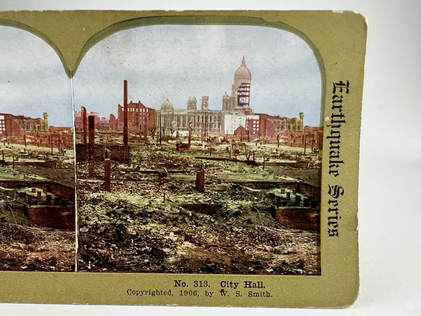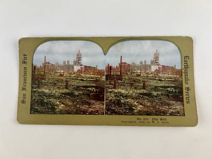 The Charlie B Gallery of Carson City, Nevada is offering this circa 1906 San Francisco stereoview of City Hall number 313 of the series by W.S. Smith if the San Francisco Fire and Earthquake Series. Light soiling and marks over the surfaces with rubs and etc at the edges. Please photographs. I am offering this single hard to find stereoview for your collecting pleasure.