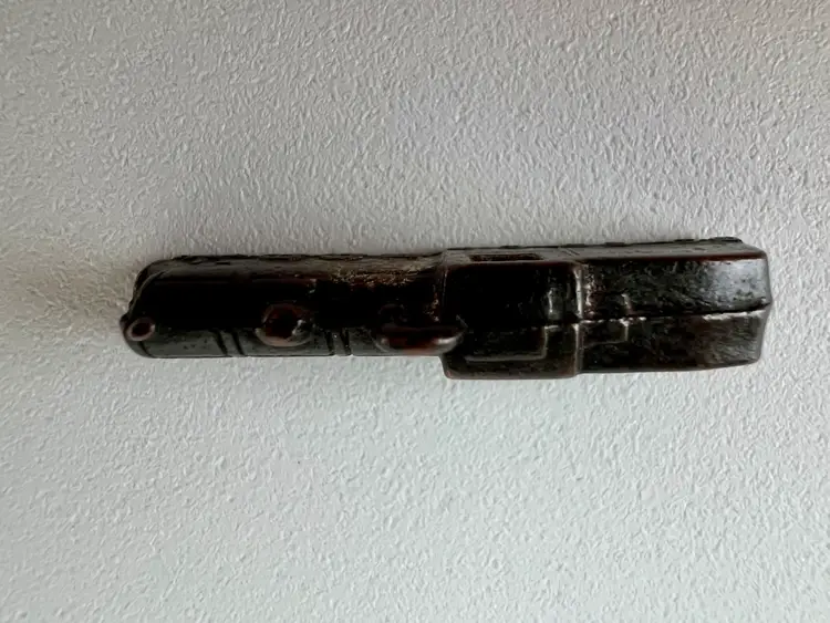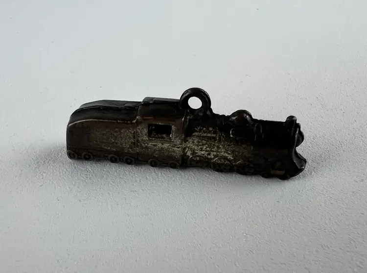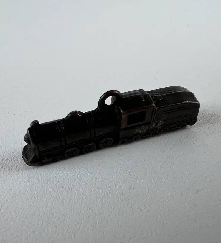 The Charlie B Gallery of Carson City, Nevada is offering this Cracker Jack prize train for sale. This dates to the 1920's. This shows the typical crudity in construction, as well as a variegated patina from light to dark with wear. This is in pleasing collector condition.