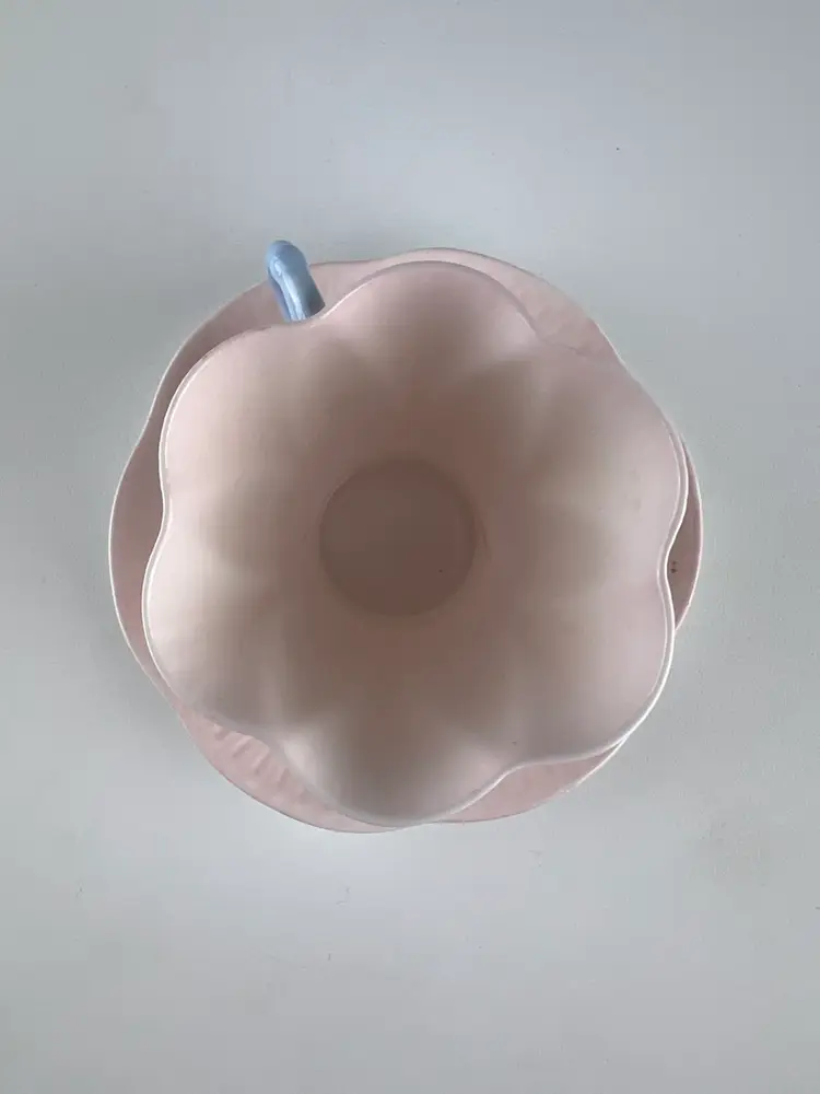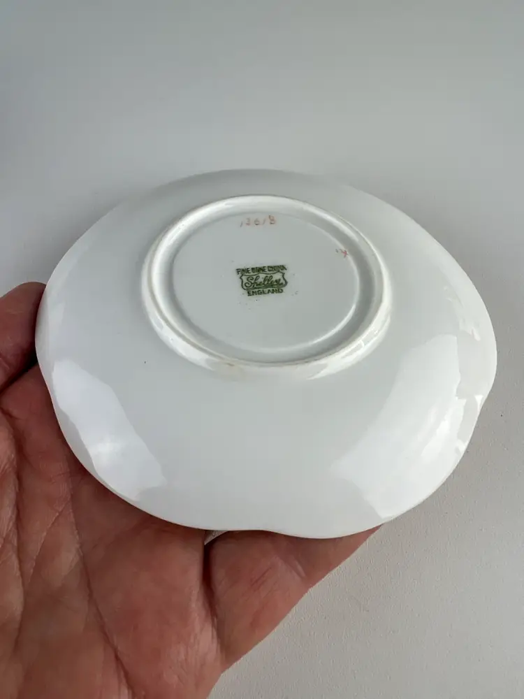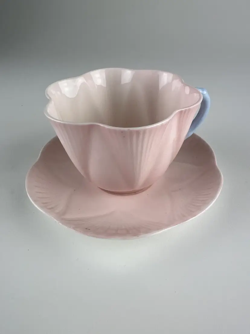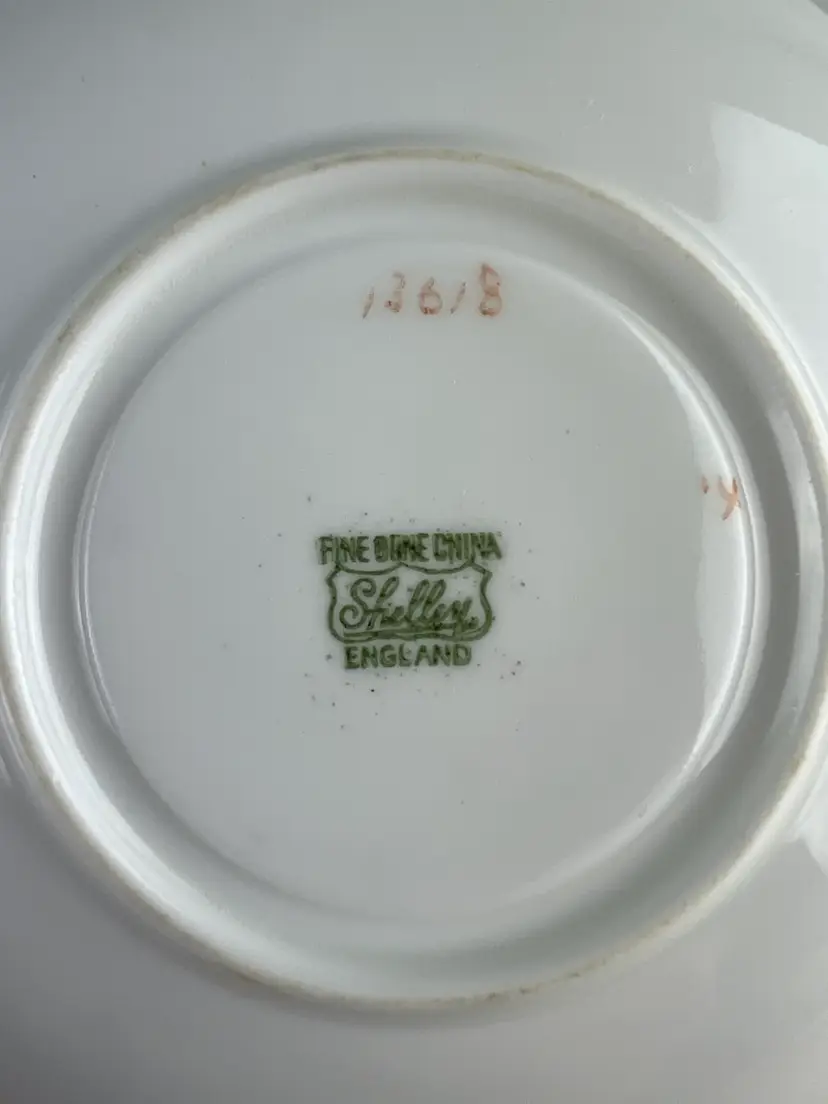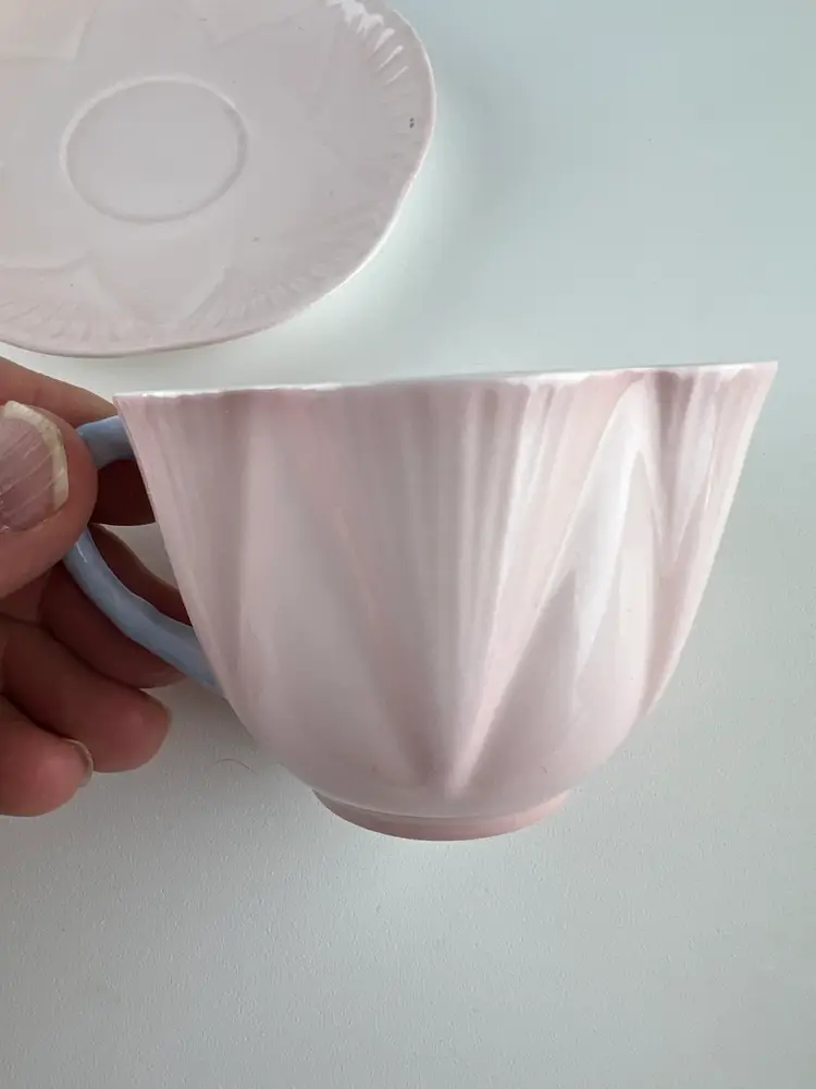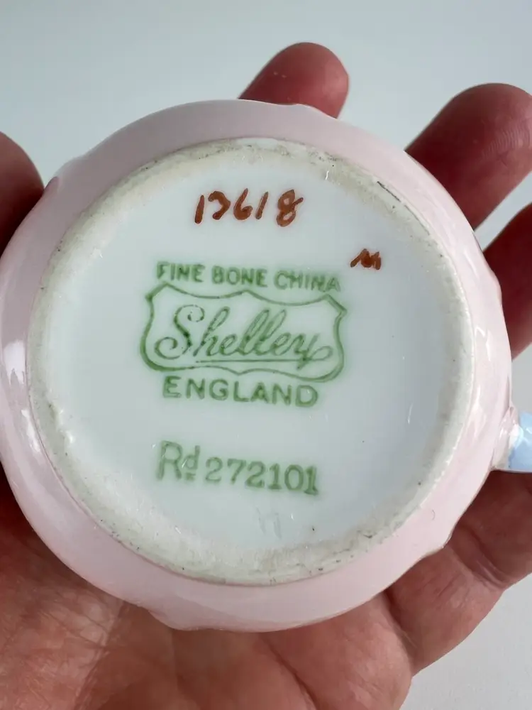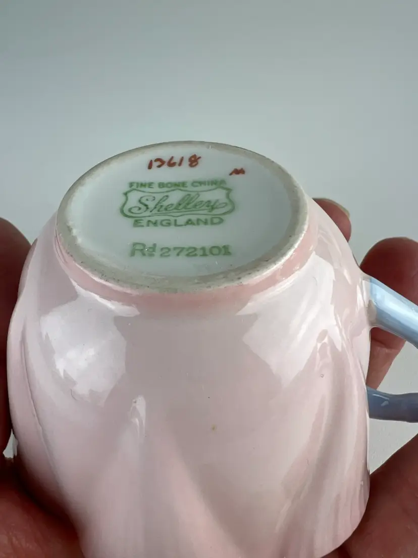The Charlie B Gallery of Carson City, Nevada is offering this cup and saucer set from the Shelley Pottery from the UK. This is in the Dainty shape and pattern 13618 with light pink and blue handle. This is part of a large group I am selling.