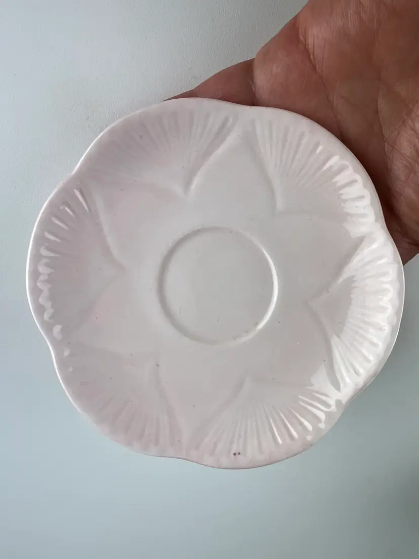 Cup measures 2.375" tall by about 3.75" at its widest. The saucer measures .625" tall by 5" wide.