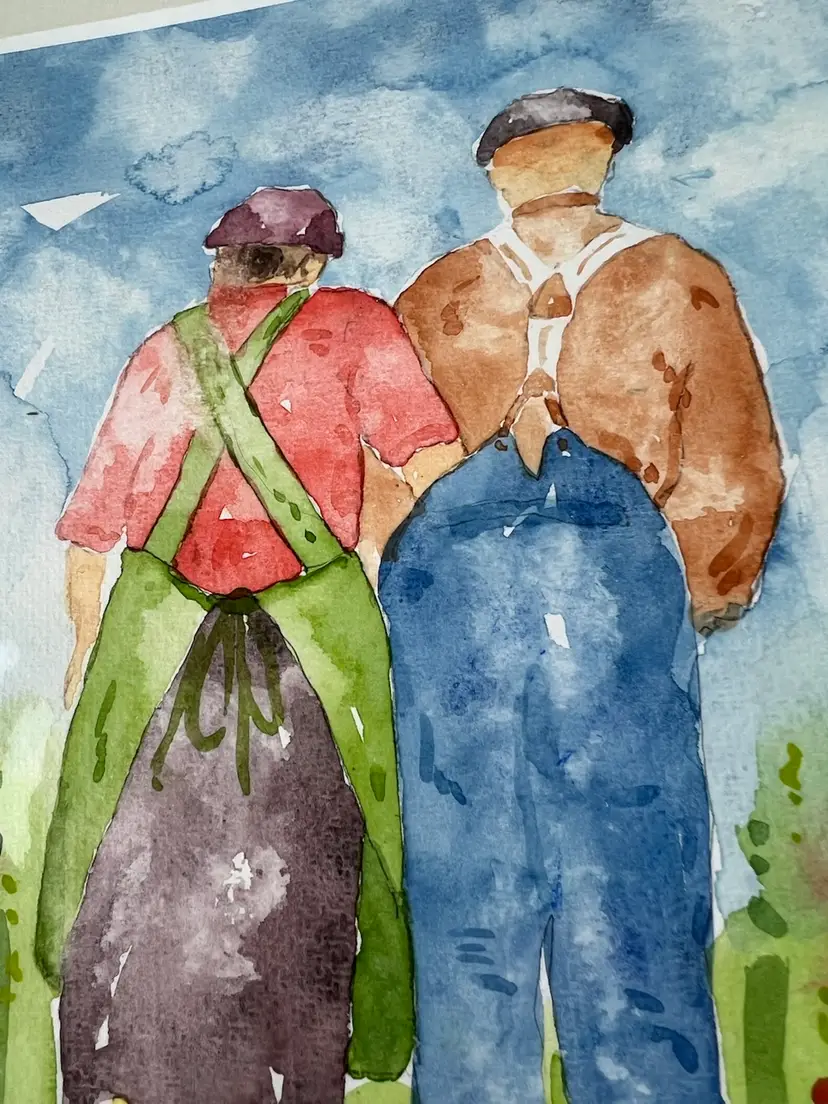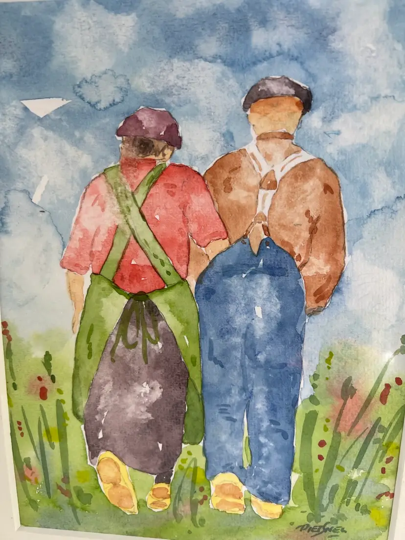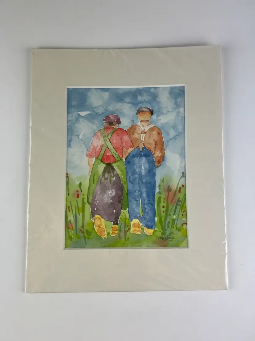 The Charlie B Gallery of Carson City, Nevada just found this watercolor in a local Nevada collection. The signature at the lower right is PietSnel in a very distinctive manner and similar to Dutch artist Pieter Snel (1911-1991). The couple in the image appear to have wood shoes or clogs and there are details of this original watercolor that make me believe this is a Dutch couple. The opening of the matt is 7.75" by 5.75" where as the matt dimensions are 11.875 by 9.375. There are some marks to the matt. This was never framed and appears to have been marketed as you see it. The image has strong pigments and the piece is every bit of charming in composition. One small, minor dark mark to the subject which appears to be original to the subject. This could be a real sleeper for the astute collector. I will run this as an auction going to the highest bidder. Start price will be $19.99. Good luck!!