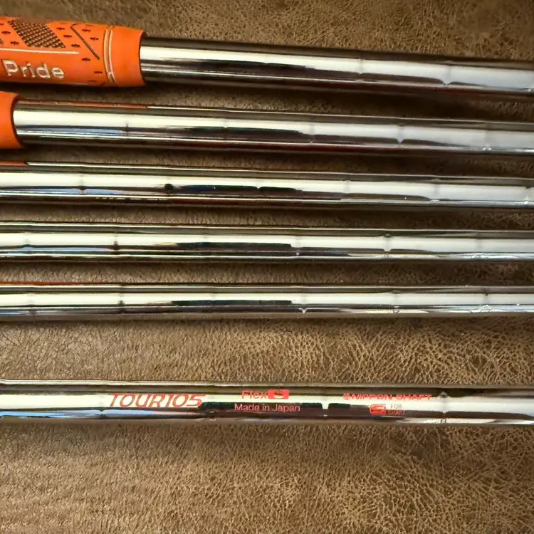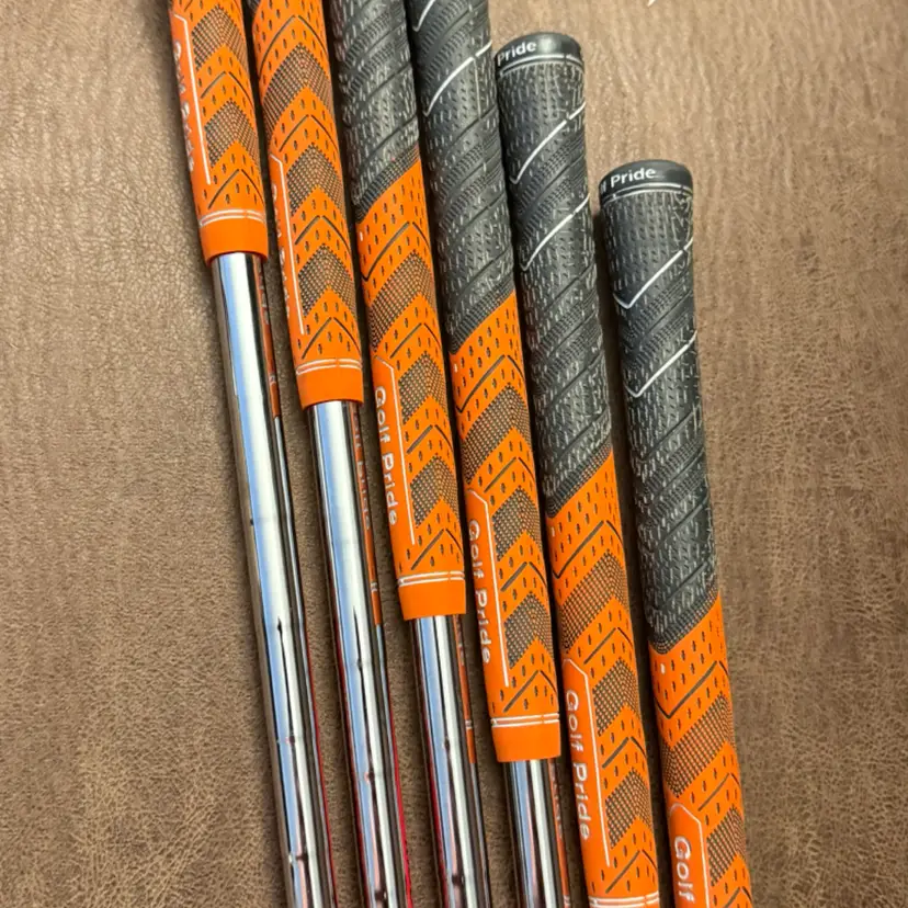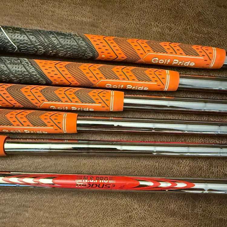 Good condition iron set, upgraded Nippon Modus Pro 3 Shafts, Tour 105 Stiff flex steel shafts, Orange & Grey Golf Pride Grips.