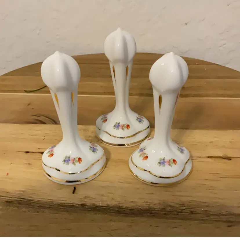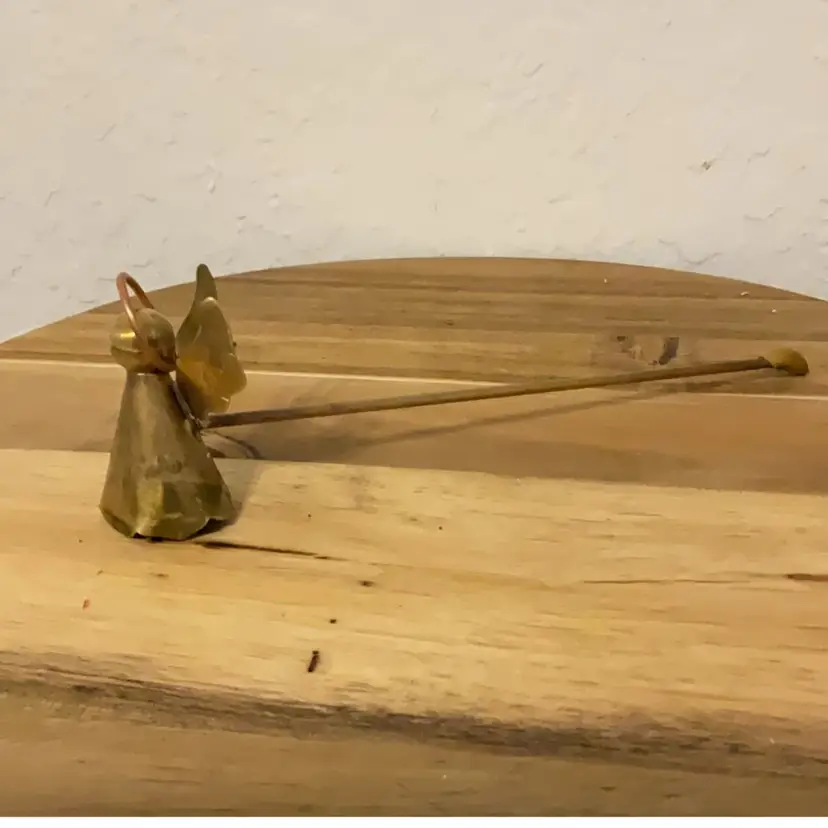 Three porcelain candle snuffers white with flowers and gold trim. One brass angel candle snuffer.