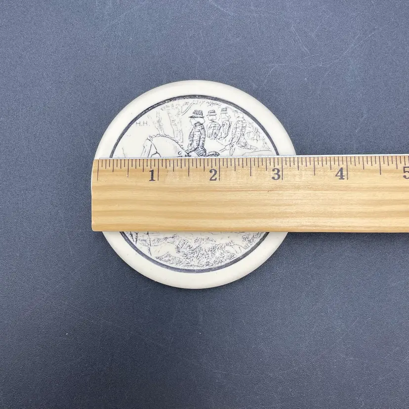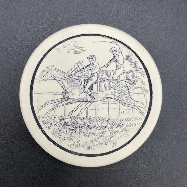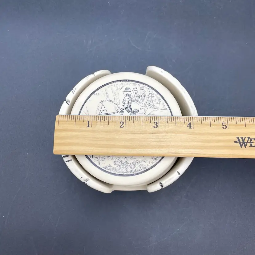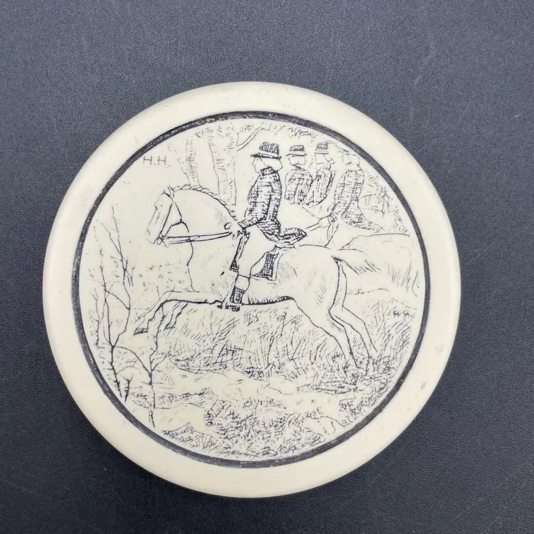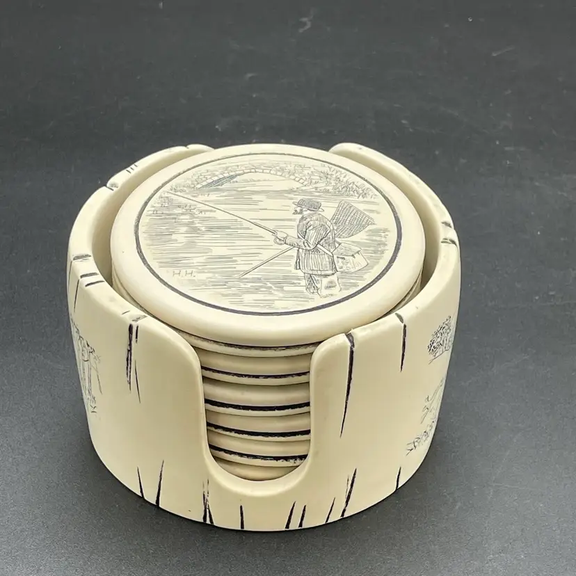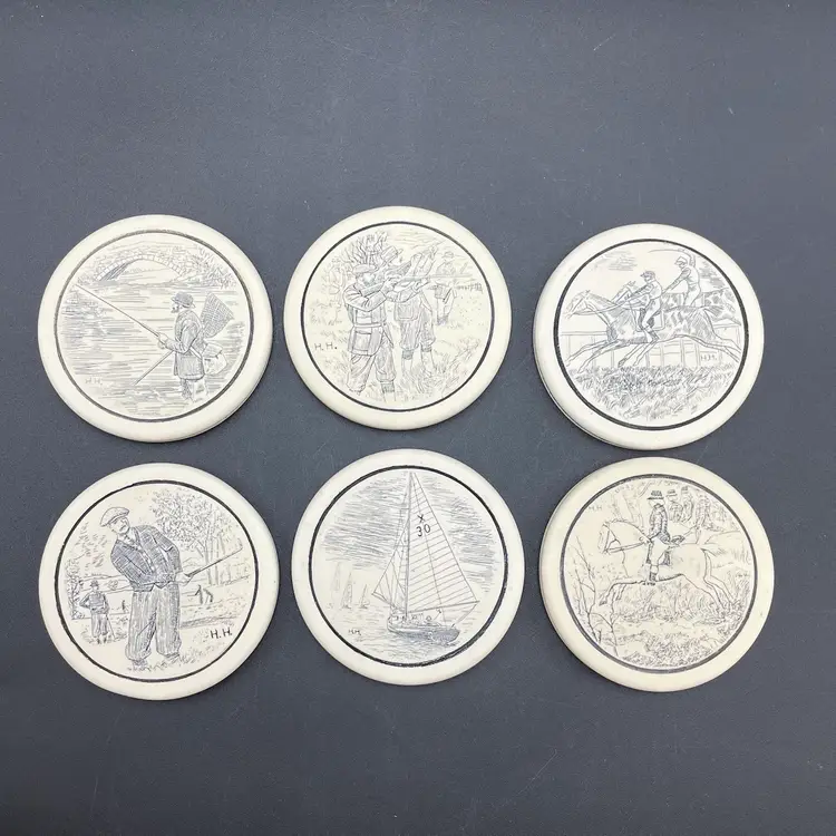 This is a vintage Comoy's of London faux Scrimshaw set of 6 rare sporting scenes coasters with holder. The scenes include fishing, hunting, golfing, sailing, horse racing, and fox hunting. Each coaster is signed H.H. Made in England. The coasters measure approximately 3" in diameter. The holder measures approximately 2.75" tall not including coasters x 4" across the top. The bottoms of all pieces are felt covered. No chips or cracks.