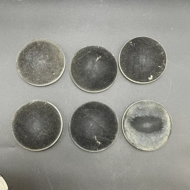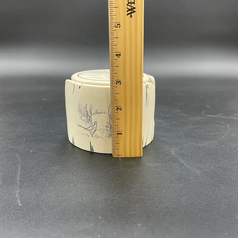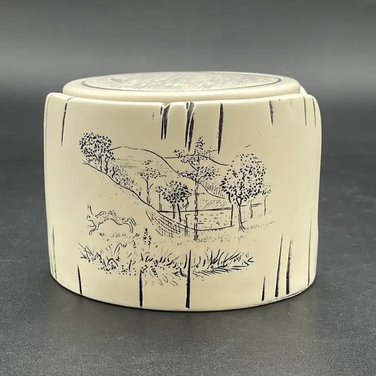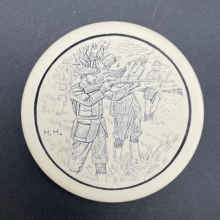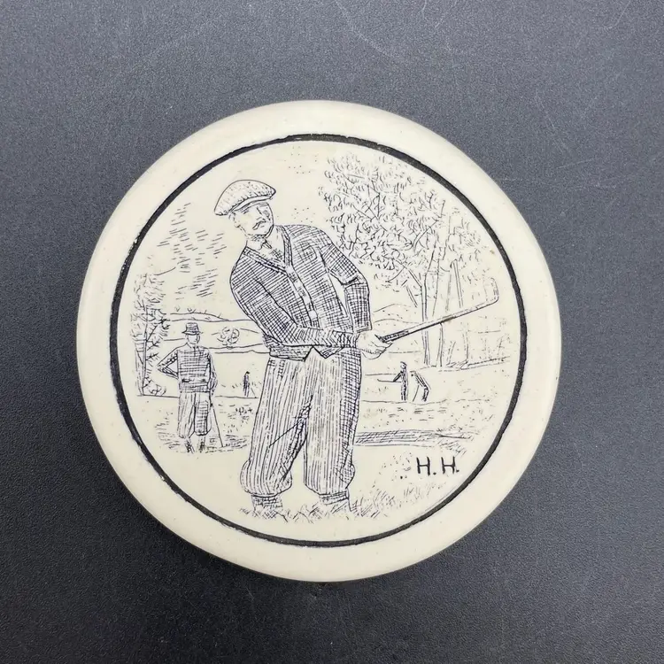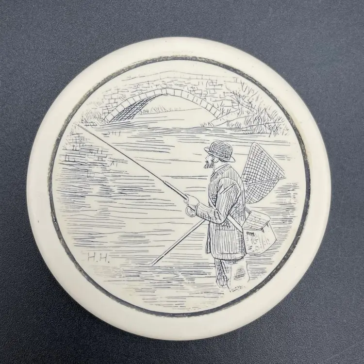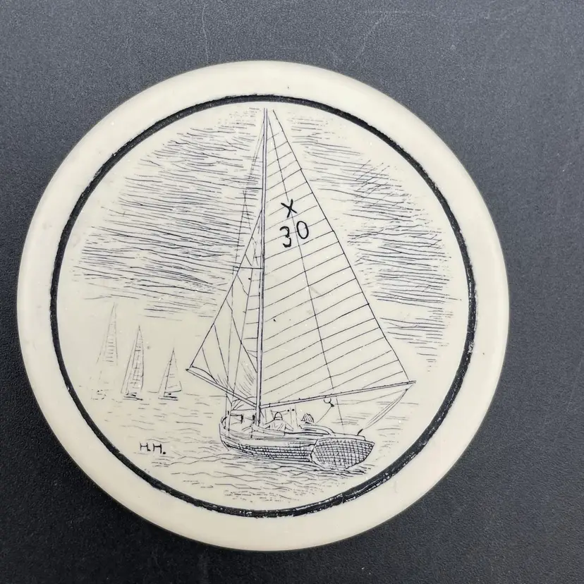 This is a vintage Comoy's of London faux Scrimshaw set of 6 rare sporting scenes coasters with holder. The scenes include fishing, hunting, golfing, sailing, horse racing, and fox hunting. Each coaster is signed H.H. Made in England. The coasters measure approximately 3" in diameter. The holder measures approximately 2.75" tall not including coasters x 4" across the top. The bottoms of all pieces are felt covered. No chips or cracks.