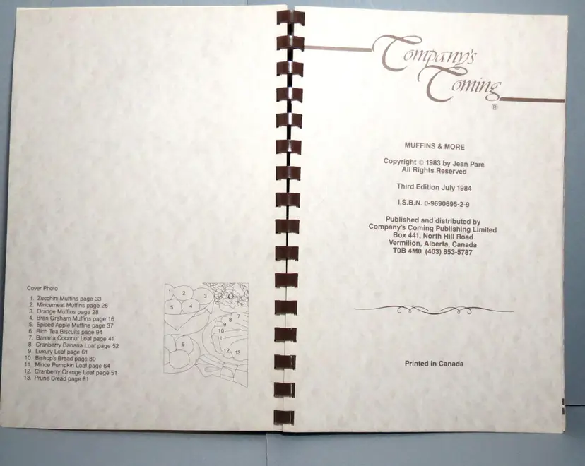 Company's Coming Muffins & More, Comb bound cookbook with 158 pages. Book in very good condition, very little handling wear, pages clean and straight. Please see photos for condition, contents and a sampling of page layout and recipe