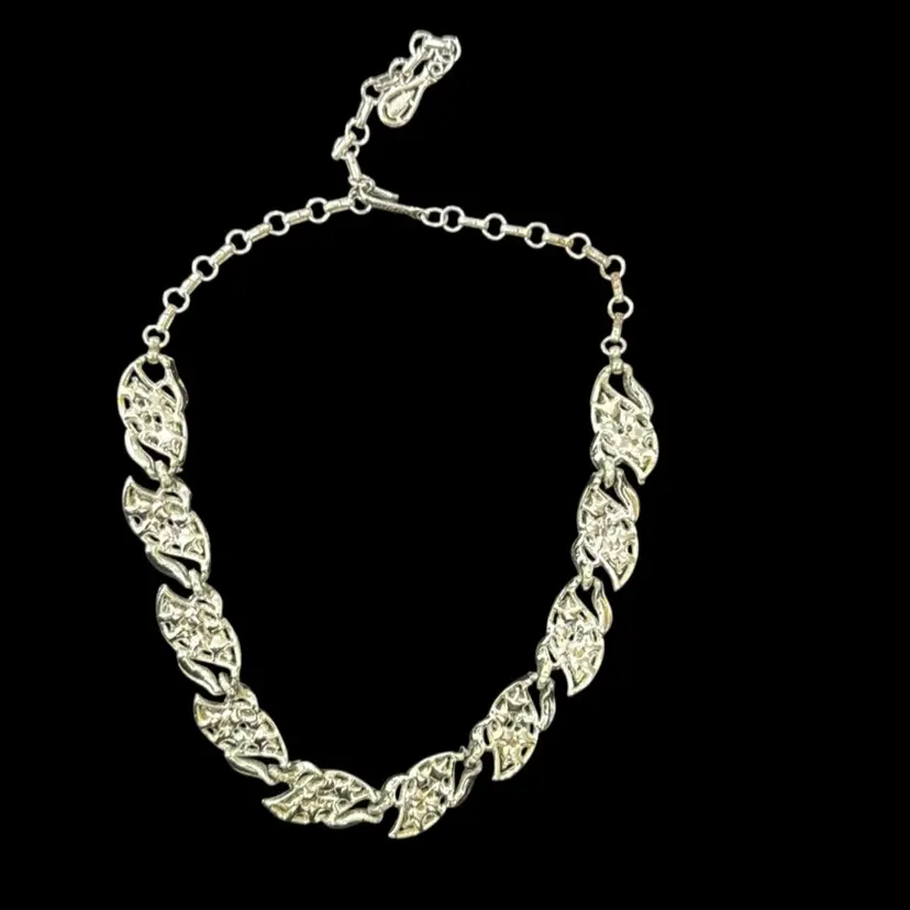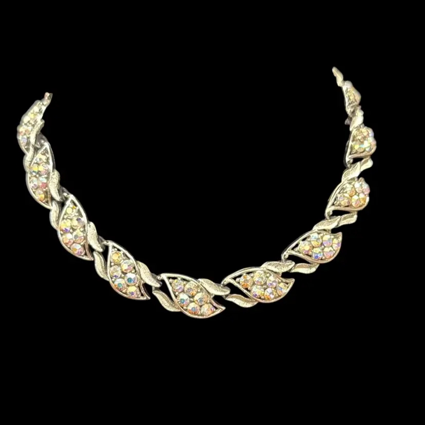 Circa 1950 - Collectible Rhinestone Necklace made by Coro. Collar style necklace/chocker features sparkly round rhinestones. They are all set in rhodium plated silver that is nice and shiny with minimal signs of wear and accented with silver leaves. The hook clasp allows the length of the necklace to be adjustable. This necklace is perfect for a cocktail dress, bride or a special evening out on the town - it is gorgeous! It is in excellent condition. 16" long Signed ©Coro on the hook