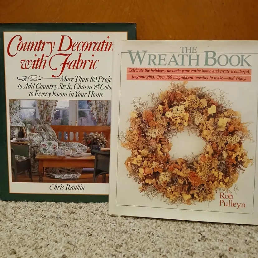 1 Hardcover Wreath book, 1 Hardcover Country Decorating with Fabric. 2 in set. Like new.