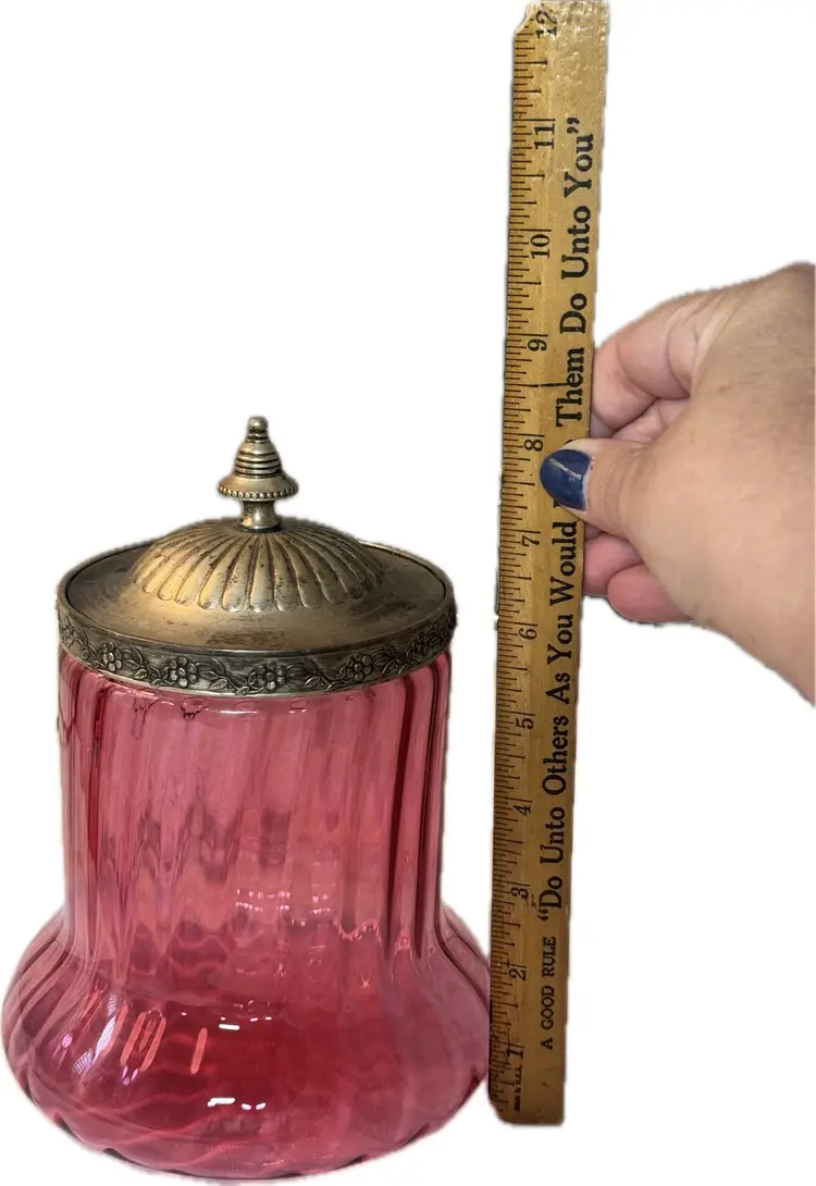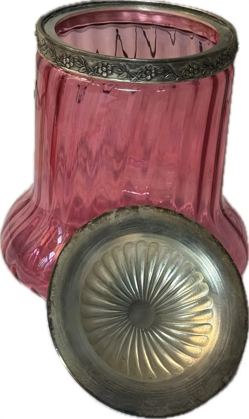 Cranberry glass biscuit jar with ornate metal lid and hanger- Possibly Victorian Era