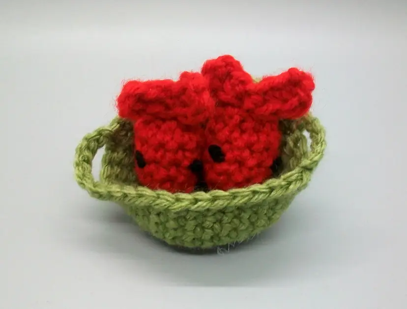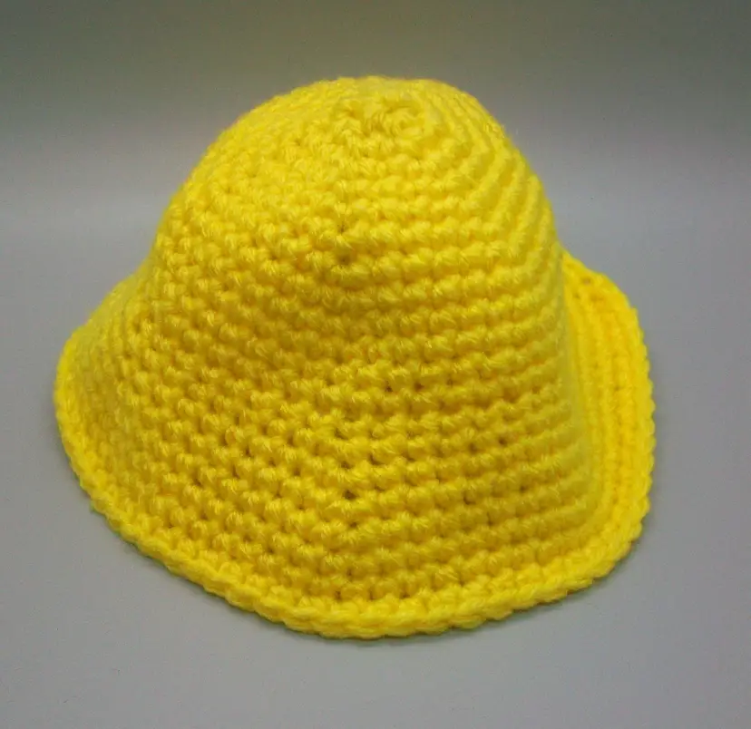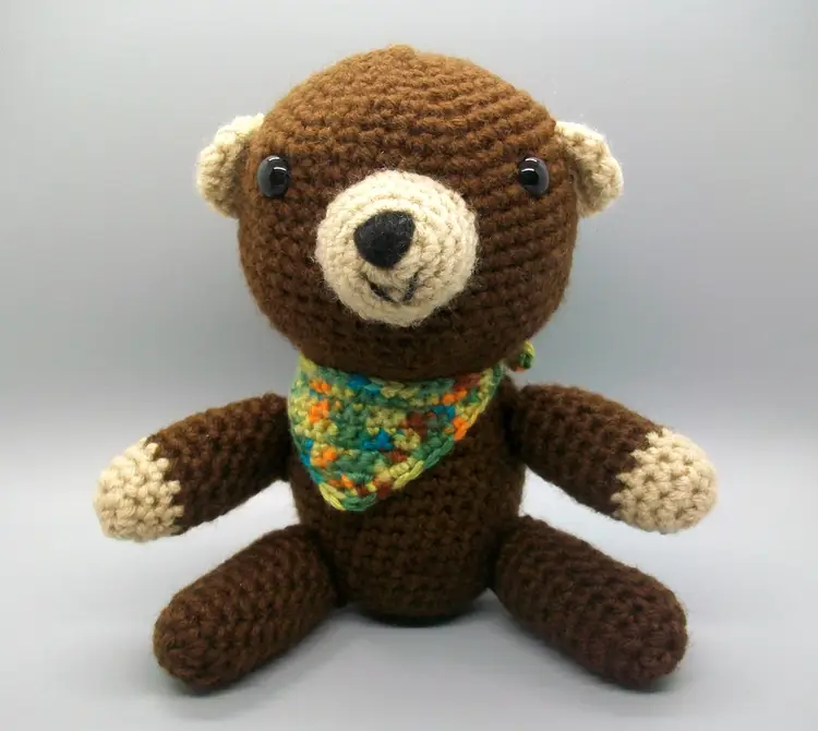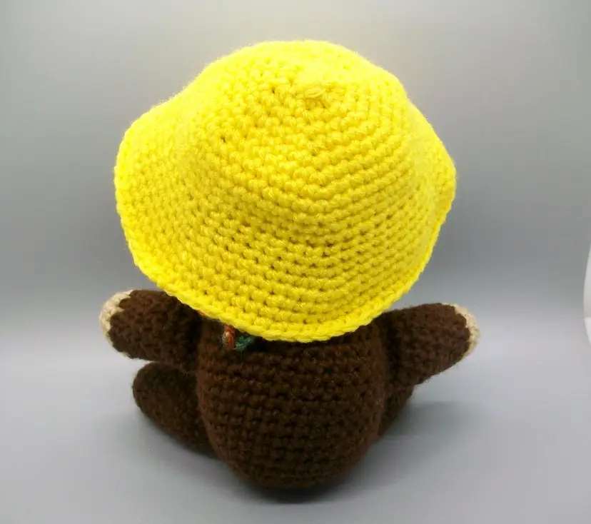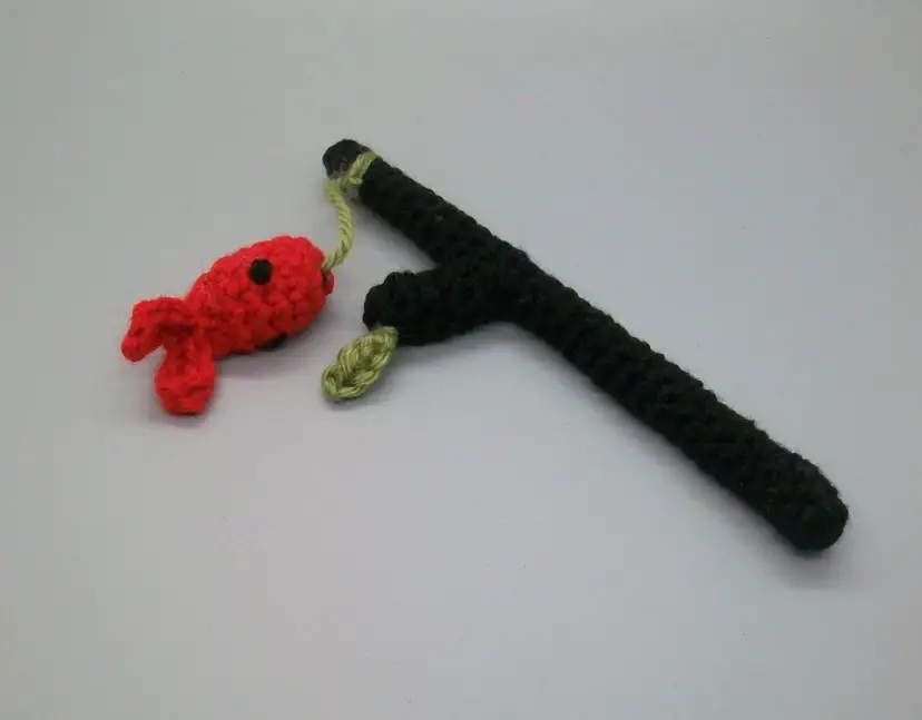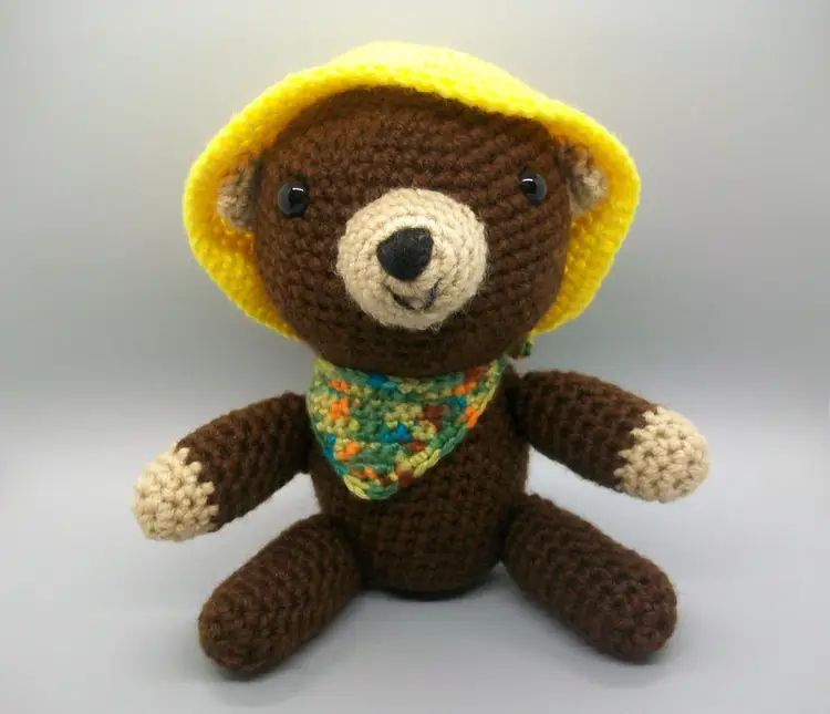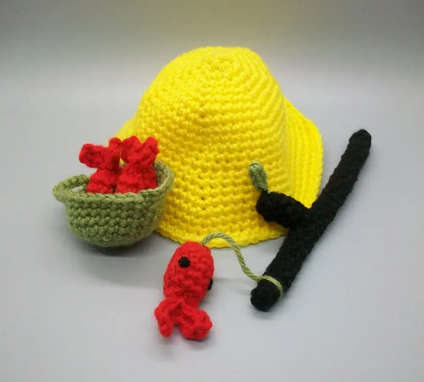 Adorable handmade crochet bear dressed as a fisherman, complete with a yellow hat, fishing rod, and basket of two red fish. Measures 7.5" tall Black Safety eyes