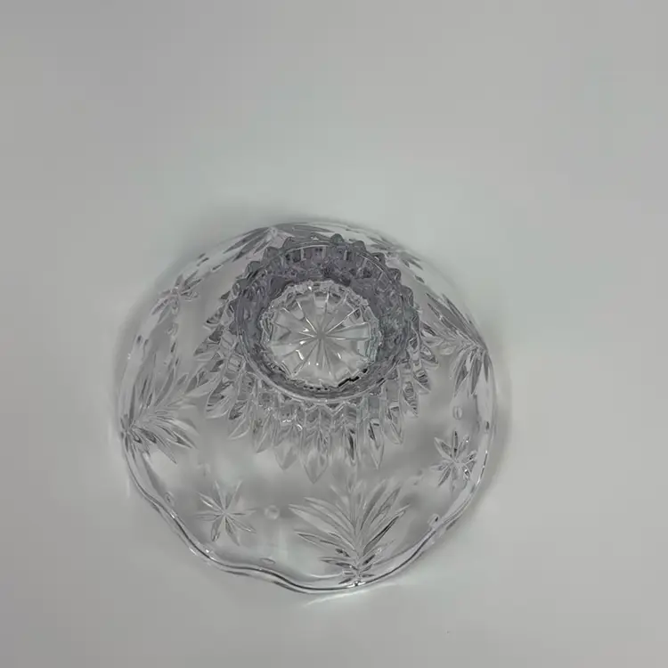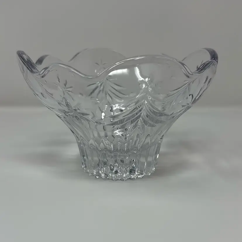 Crystal bowl embellished with evergreen trees and snowflakes. Excellent condition. No chips, cracks or dings. 6” round, 4” tall