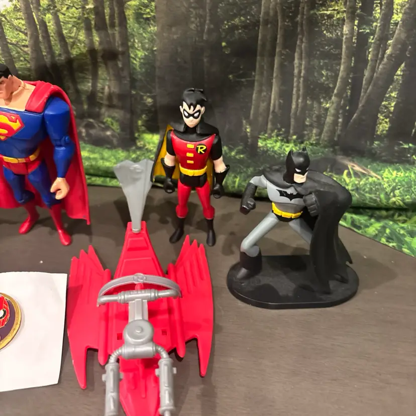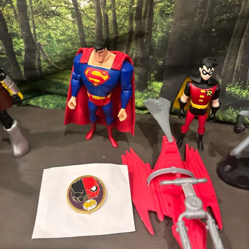 Dc Characters With Some Random Figures, Batman, Superman, And Robin