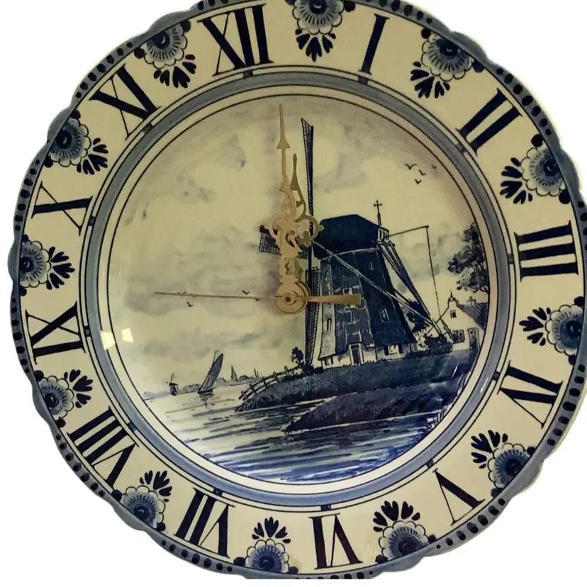 This is a Delft Blue wall plate clock featuring a Dutch windmill scene,great condition