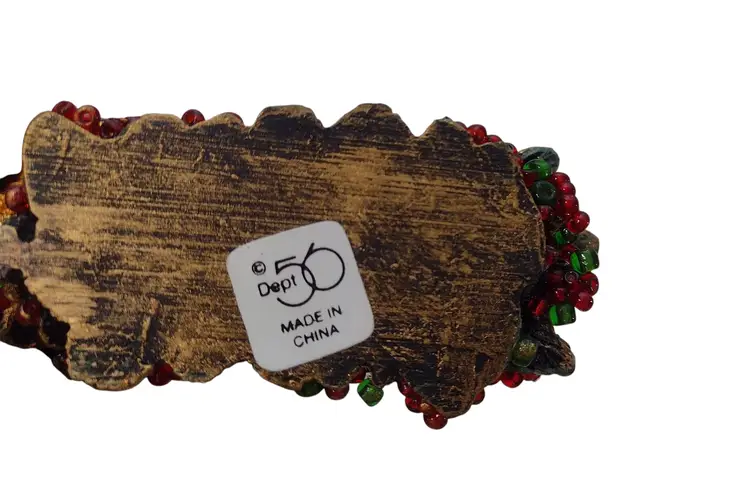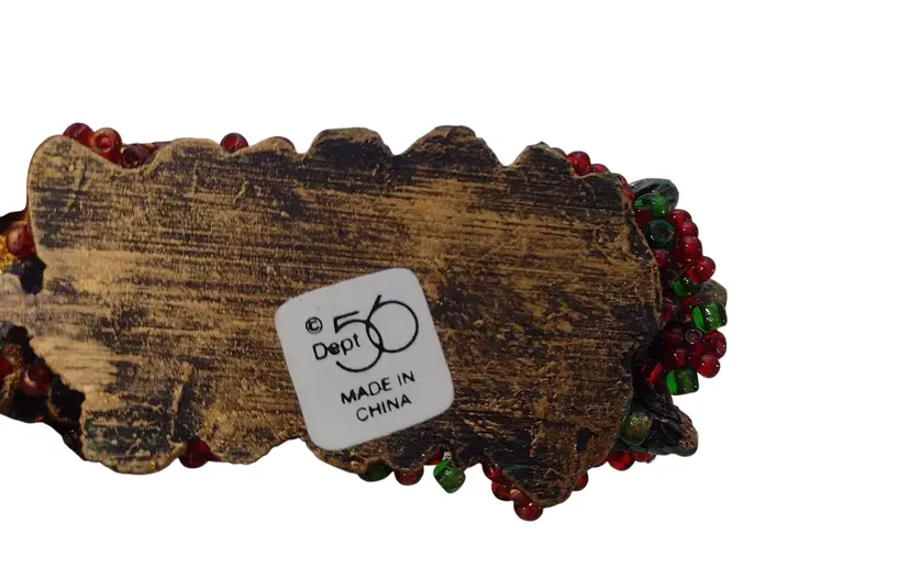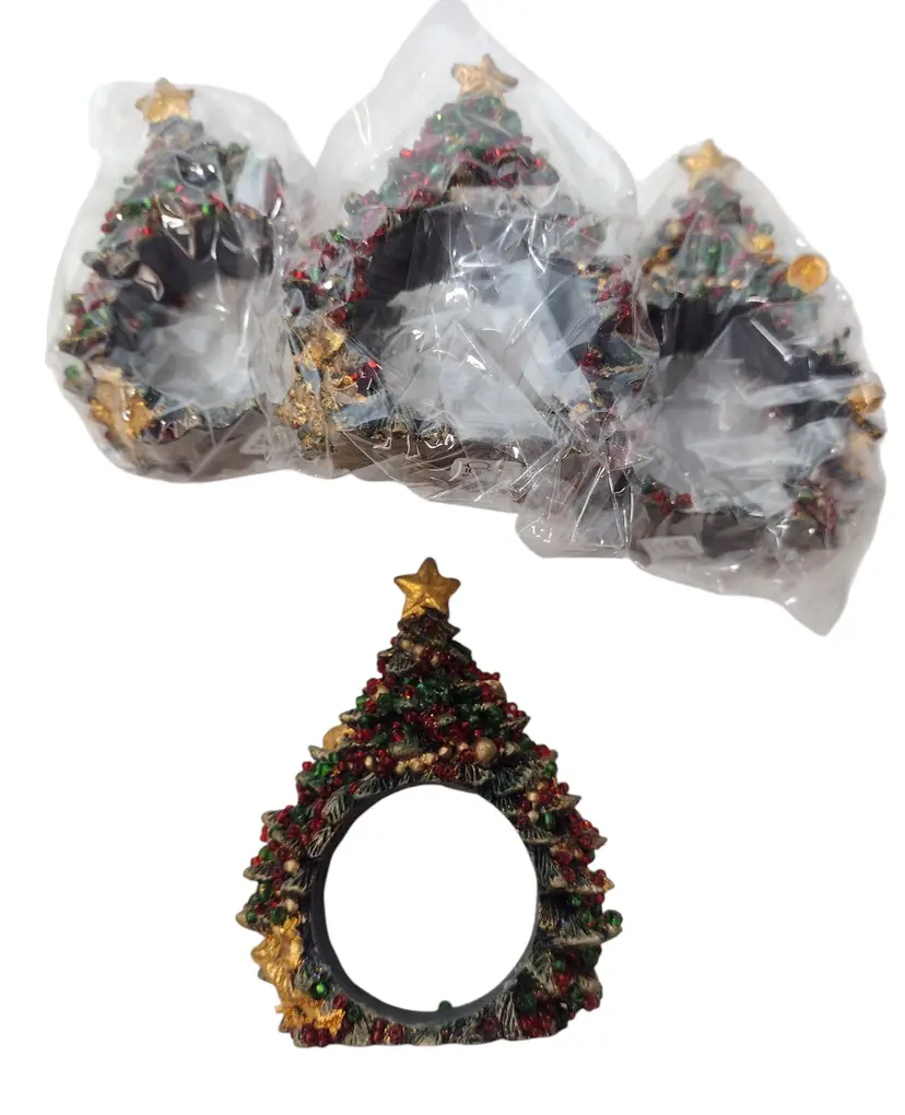 These are pretty solid resin Christmas Tree napkin rings with red & green beans & gold ornaments & star. Rings measure 3.5" tall x 2.75" wide x 1.75" depth.