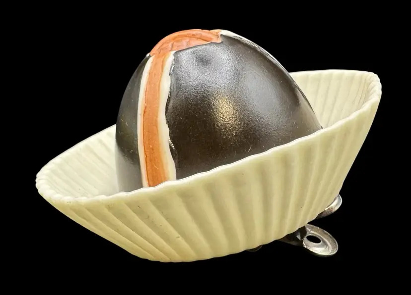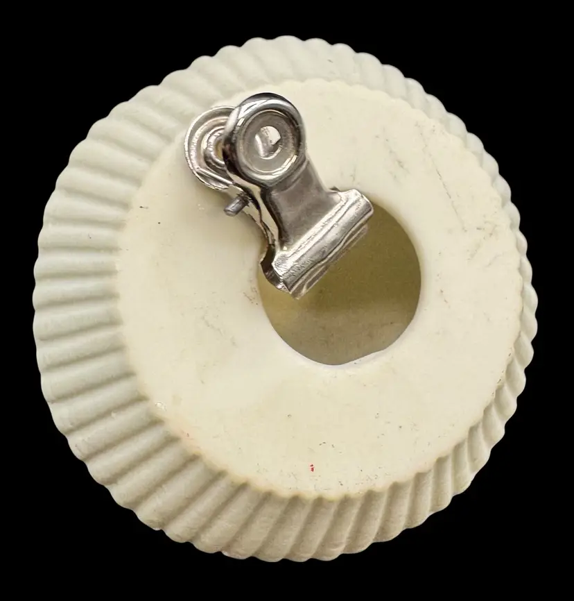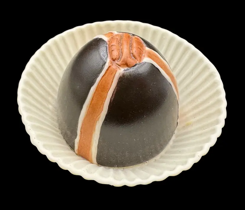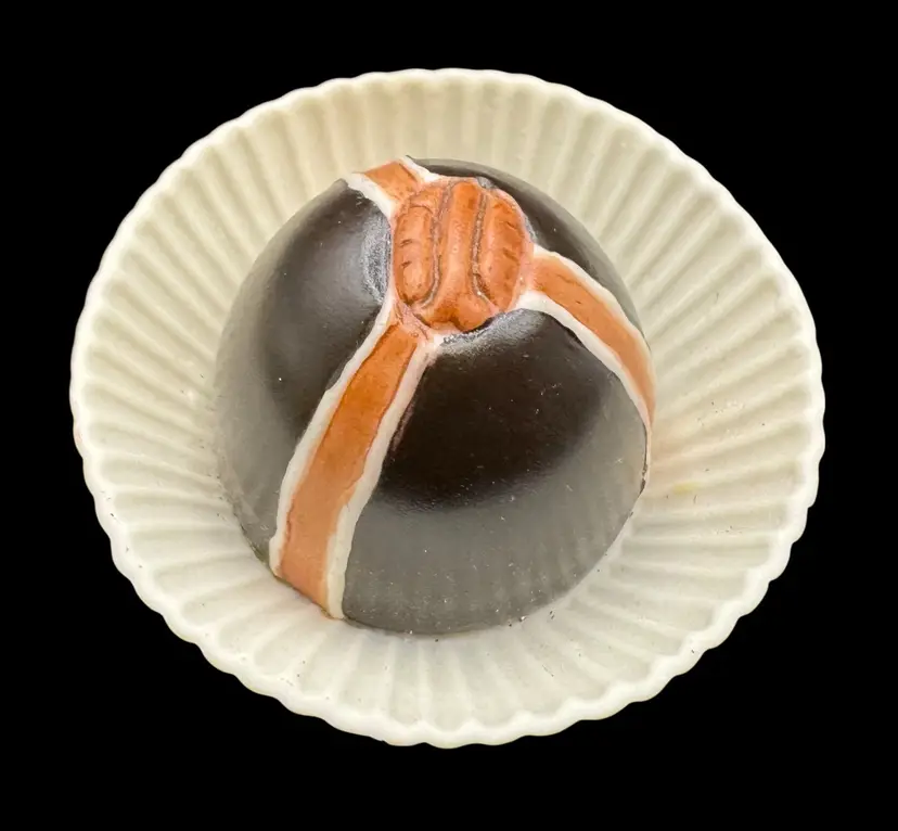 Clip-on ornament shaped like a chocolate truffle. It is made of a thin bisque porcelain made to sit over a string light.