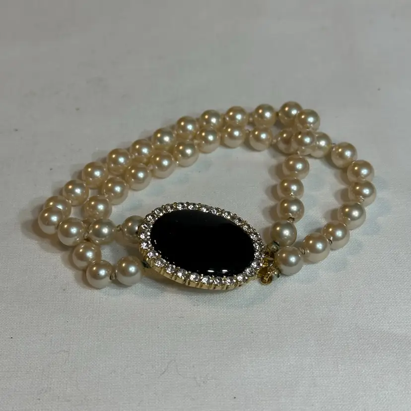 Double Strand Faux Pearl With Black Acrylic Center And Rhinestone Accent Bracelet 7”