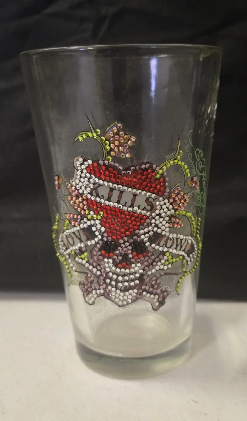 Ed Hardy Love Kills Slowly Beads Skull Drinking Glass is a stylish and unique glassware item featuring a bold skull design, perfect for collectors or those looking to add a touch of edgy sophistication to their kitchen or home decor. This drinking glass is part of the iconic Ed Hardy brand, known for its quality and distinctive aesthetic, making it a standout piece for any glassware collection.
