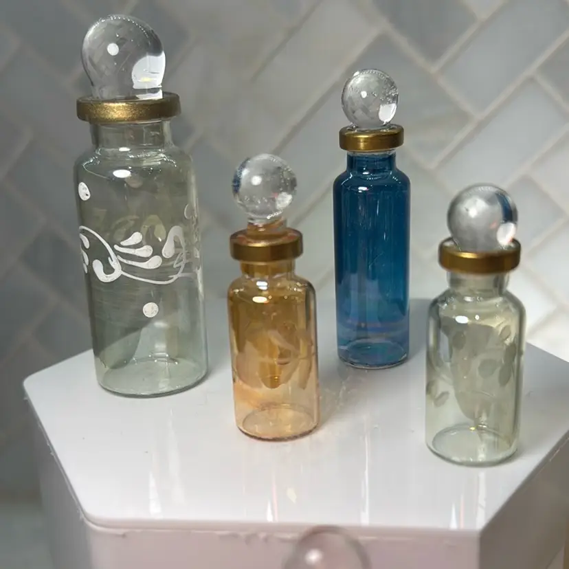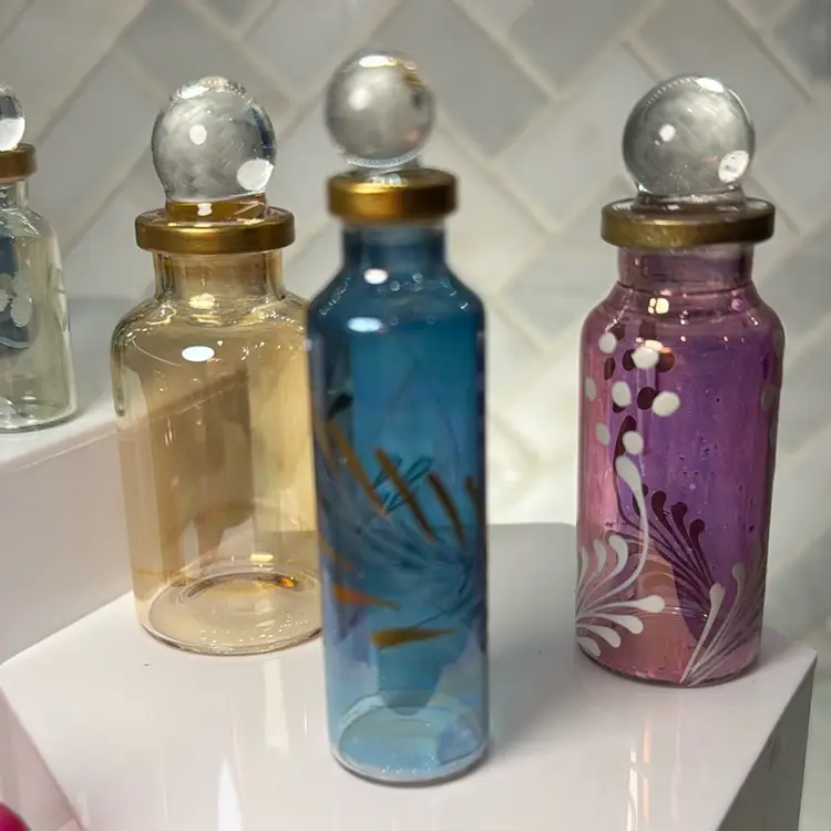 Egyptian Perfume bottles, Empty Glass Mini Bottles for Perfume, Essential Oils or Potion - Set of 10 Decorative Small Vials, Each 2"-3” High, Assorted Colors