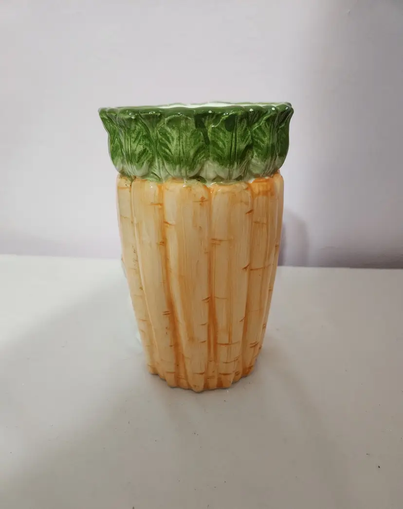 This can be a vase or utensil holder. It features a rabbit holding on to carrots. This is from Enesco. Made in Taiwan. It stands approximately 6 3/4 inches tall. It is 4 inches wide. It is overall in good condition. There are a few flea bites around the top from the way the lady at the thrift store packed it.