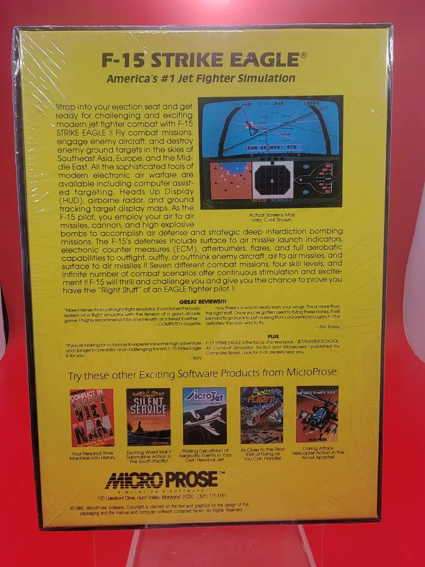Item specifics Condition Brand New: An item that has never been opened or removed from the manufacturer’s sealing (if ... Read moreabout the condition Region Code NTSC-U/C (US/Canada) Platform Atari 400/800/XL/XE Release Year 1985 Rating E-Everyone Publisher Micro Prose Genre Simulation Game Name F-15 Strike Eagle Category breadcrumb Electronics Video Games & Consoles Video Games