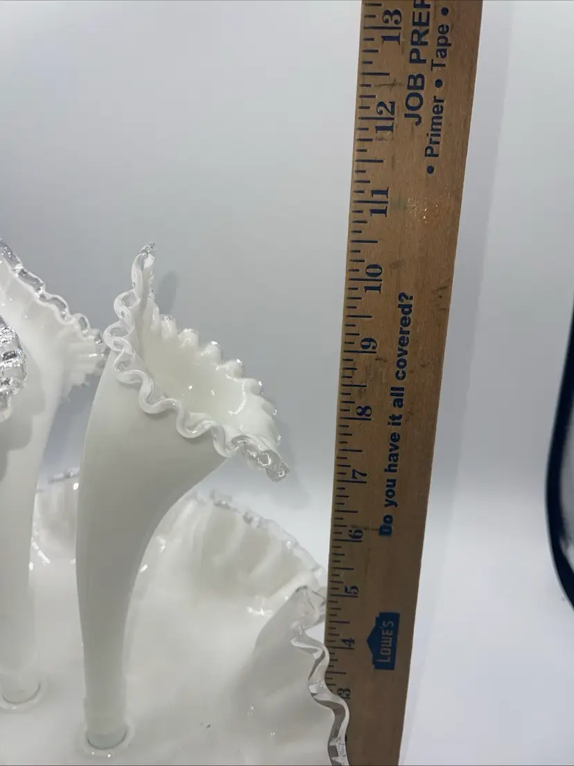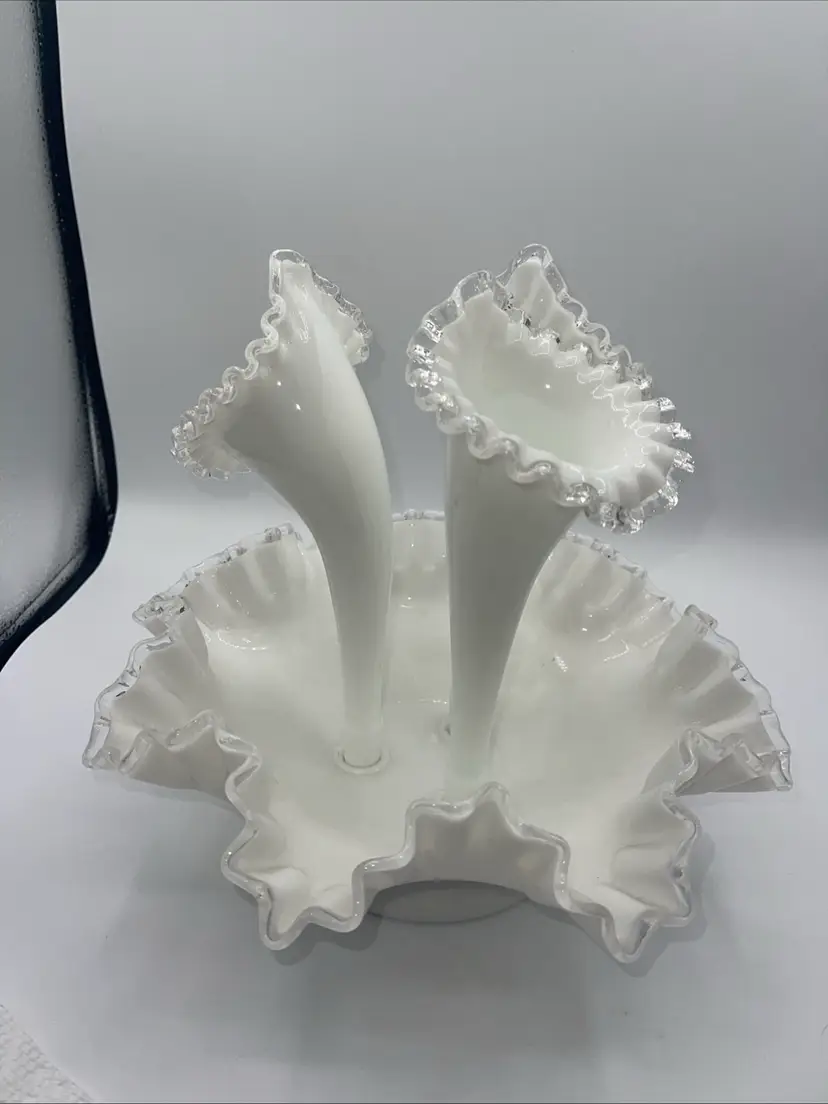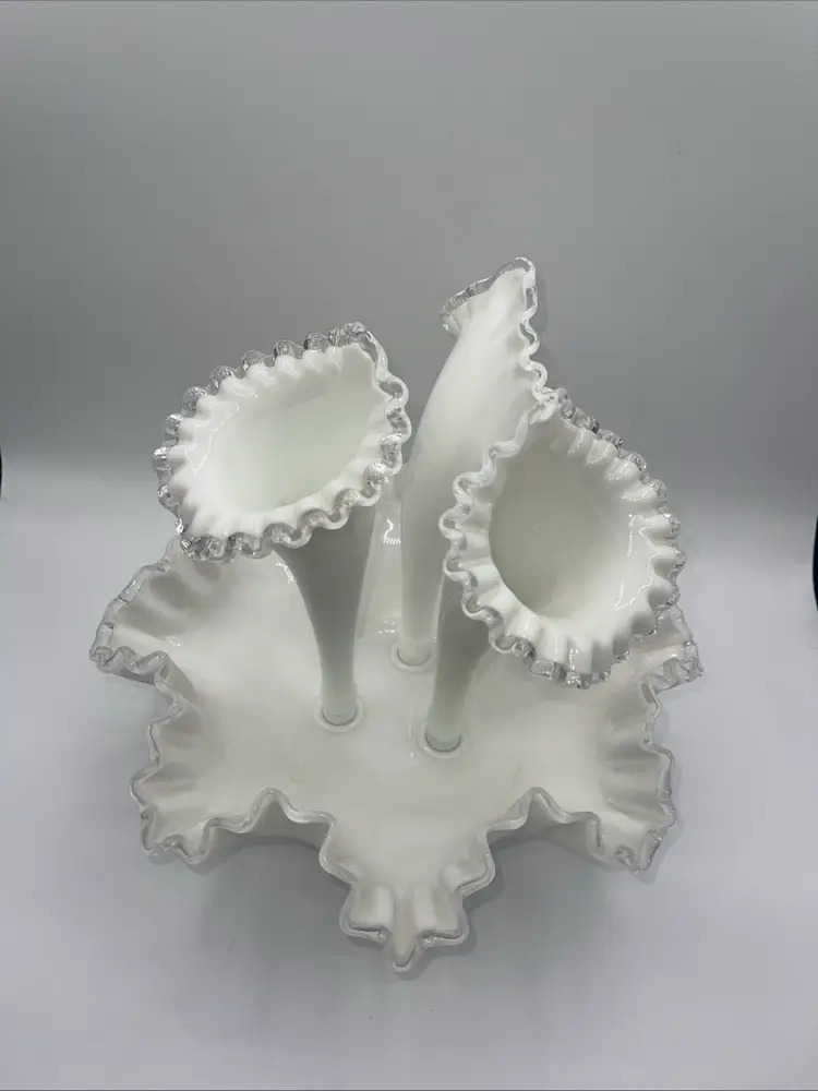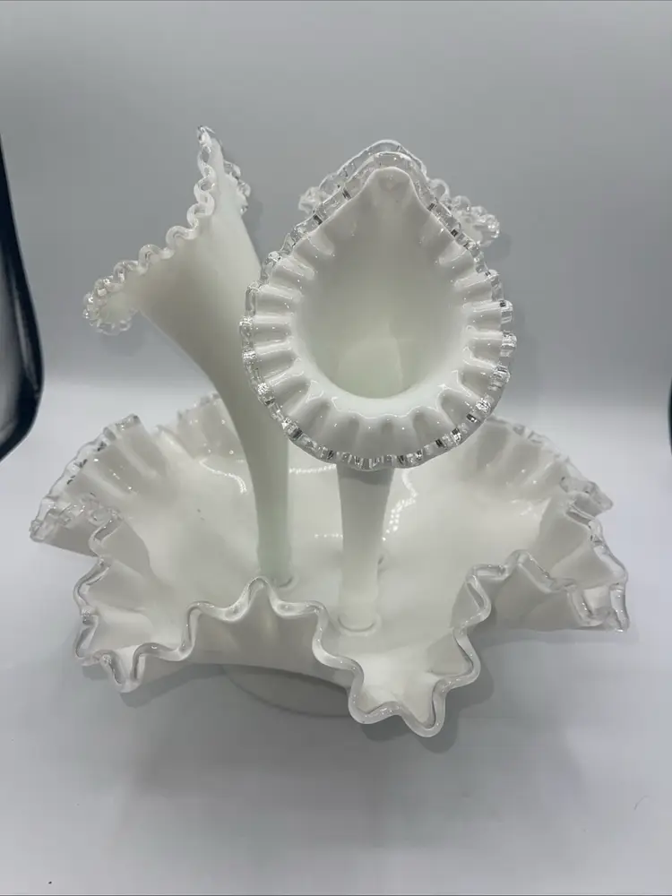 Fenton 3 Horn Epergne Milk Glass Silver Crest Vase 10.5” Vintage Milk Glass