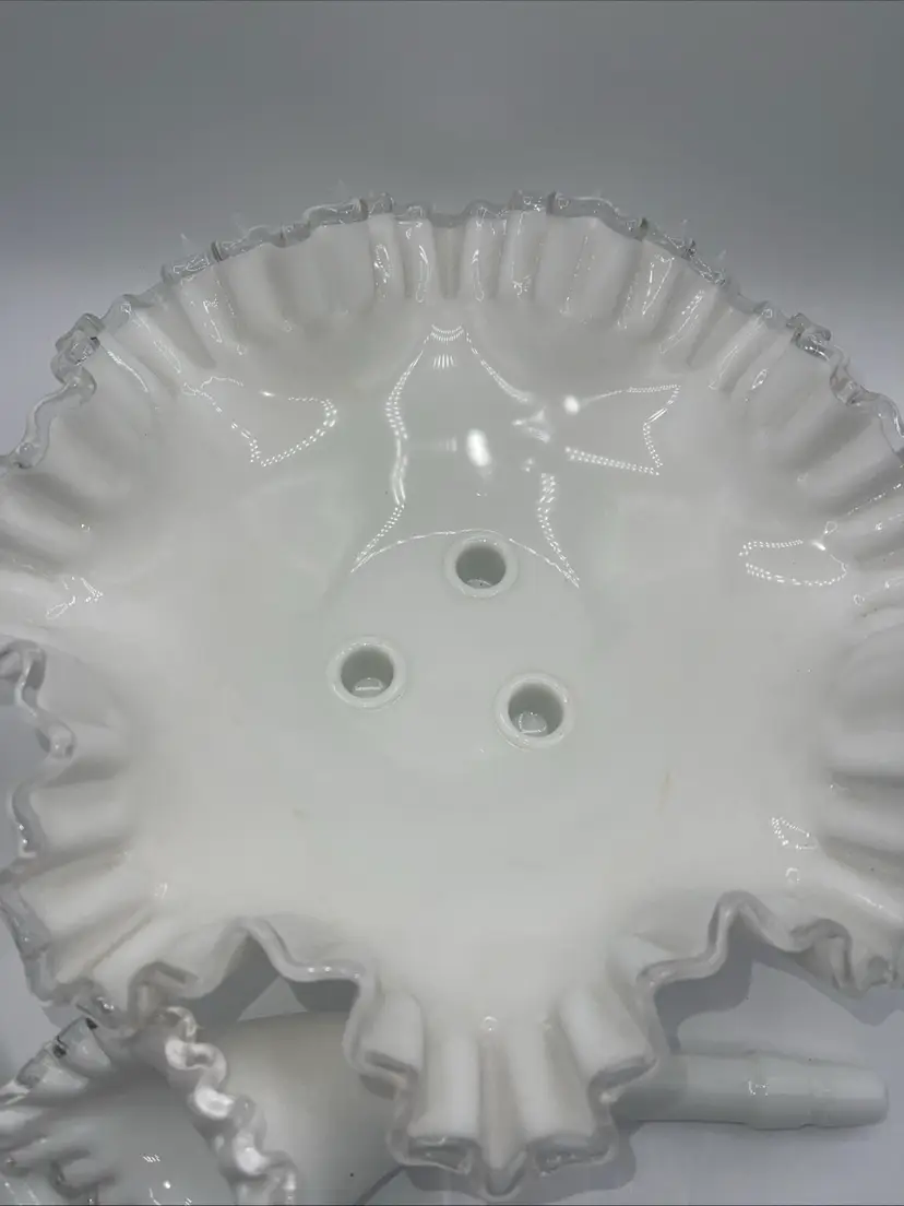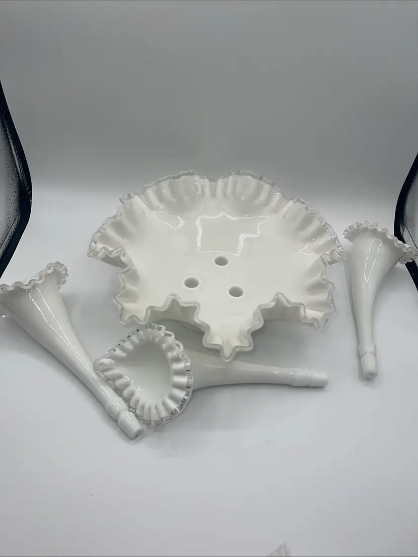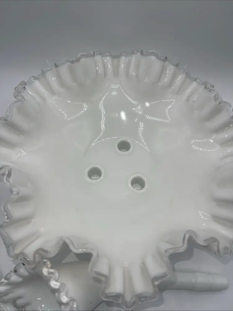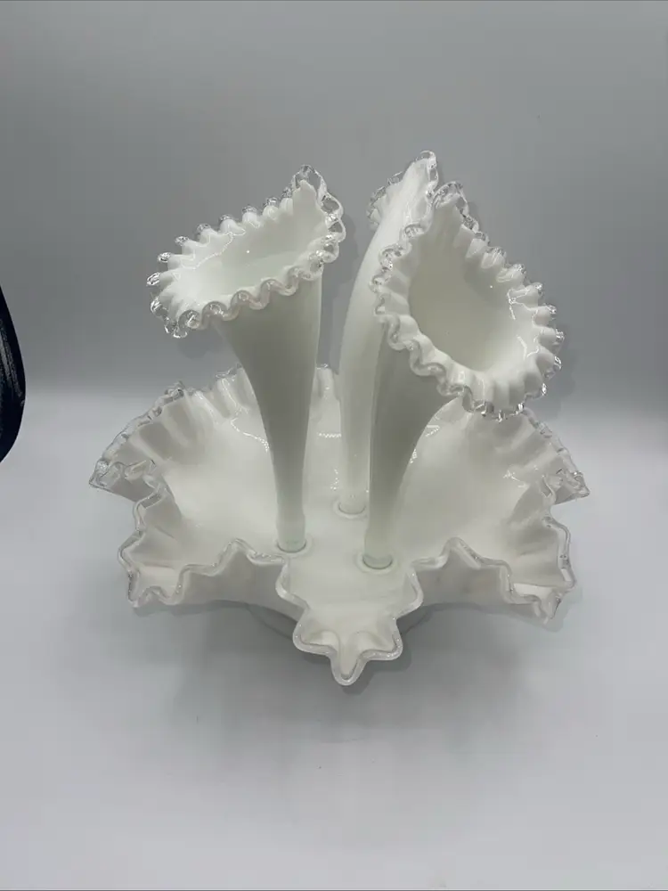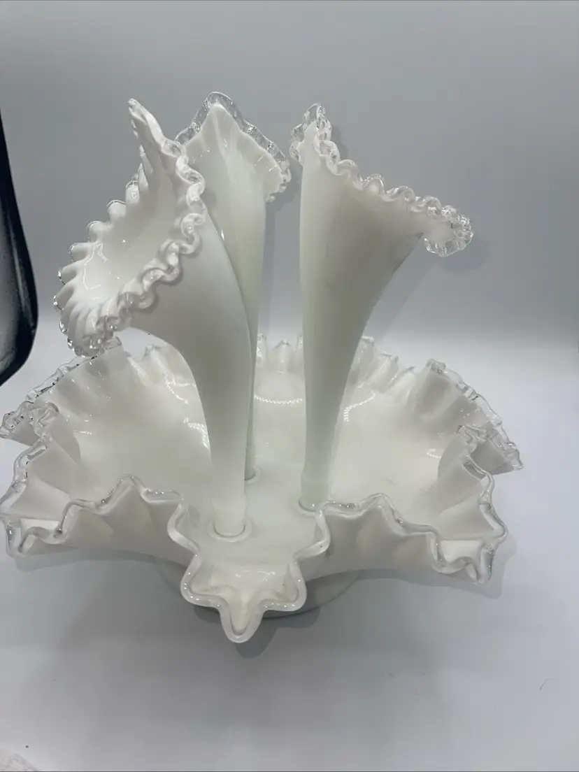 Fenton 3 Horn Epergne Milk Glass Silver Crest Vase 10.5” Vintage Milk Glass