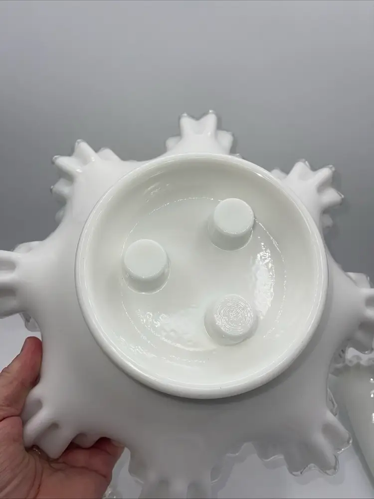 This is a beautiful piece. There is no damage noted. It is the three horn EPERGNE milk glass silver crest Fenton vase please see all pictures. It is 10.5 inches. I’ve taken pictures with the horns in and out, so you can see ask any questions you may have. Thank you for looking.