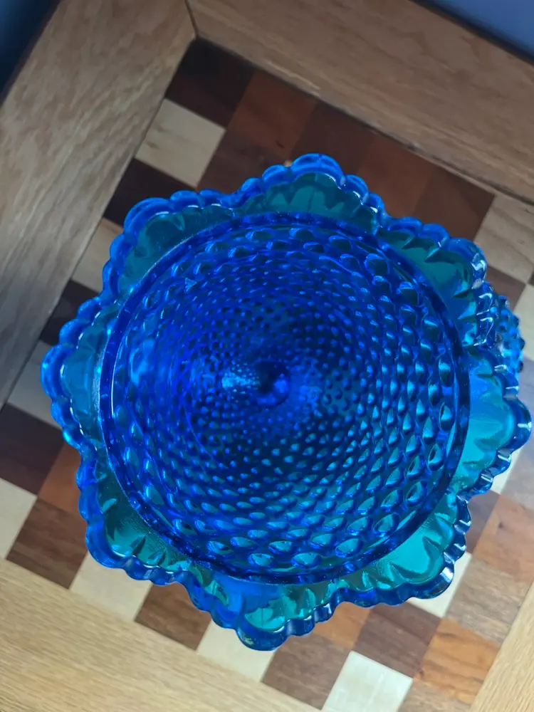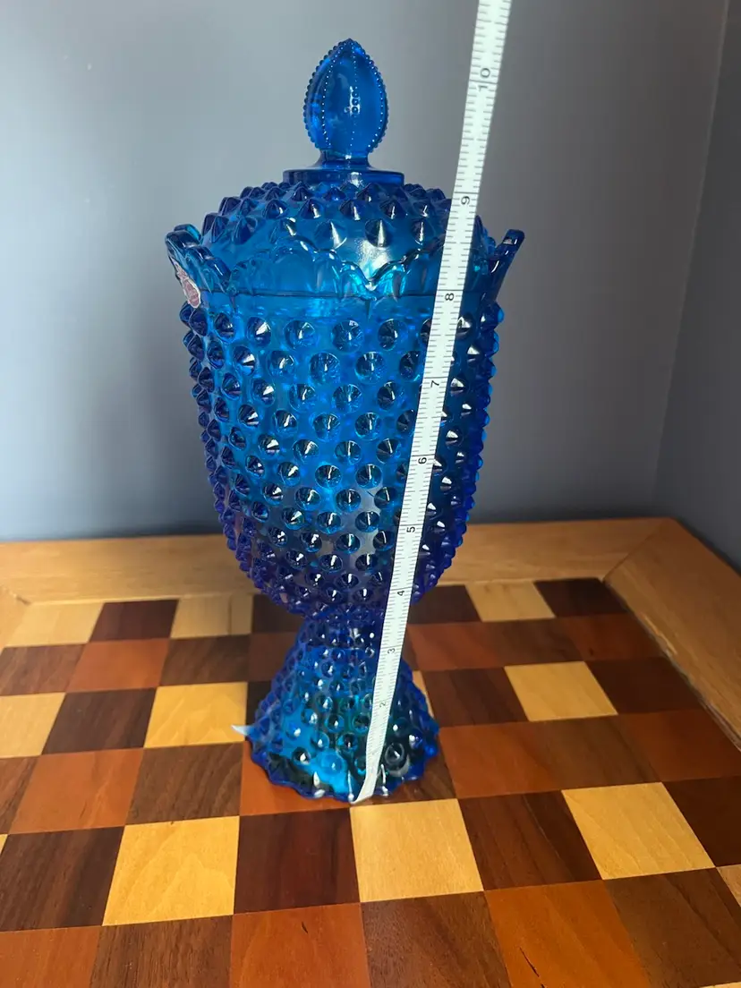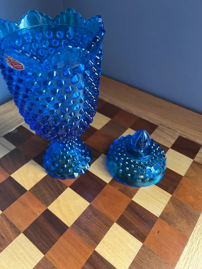 Authentic Fenton, colonial blue hobnail apothecary jar with lid