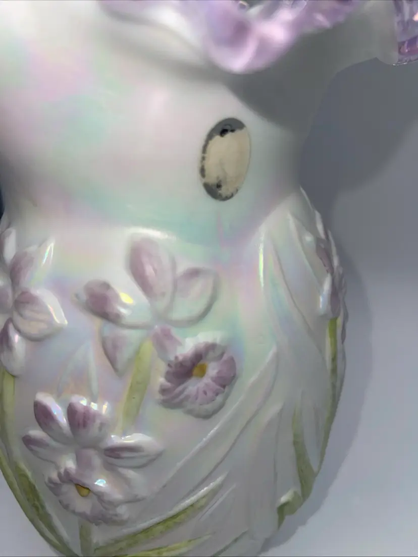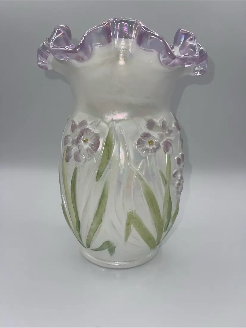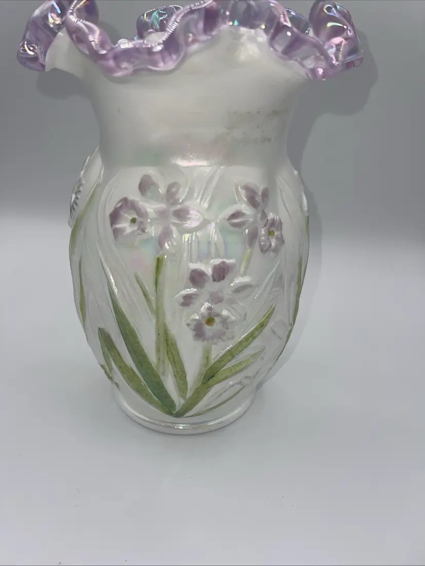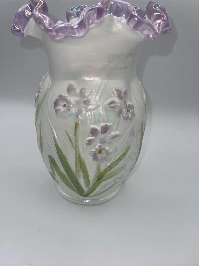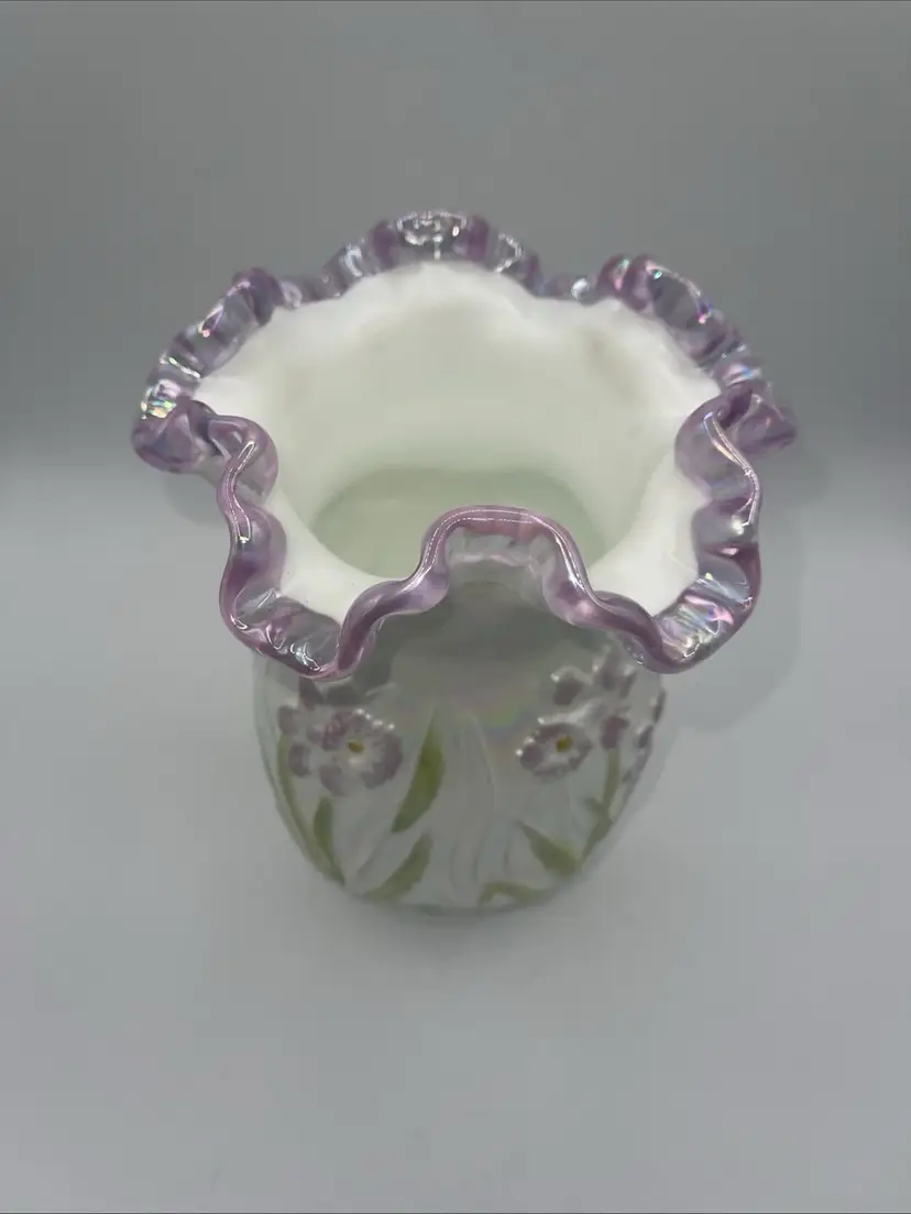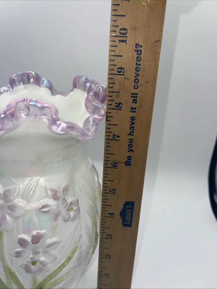 It does have the remnants of the Fenton sticker please see the last photo. It has a beautiful lilac/purple rim to the ruffle and the flowers.