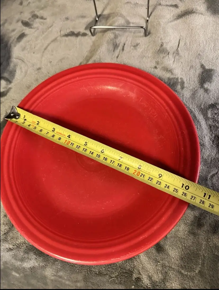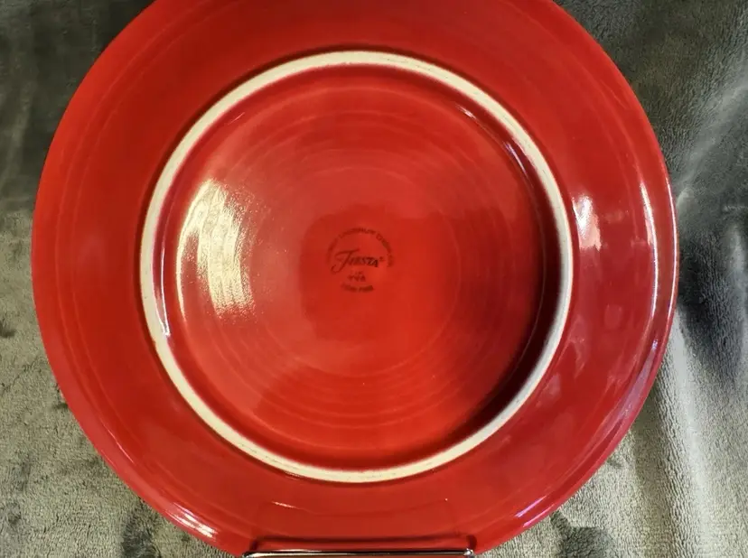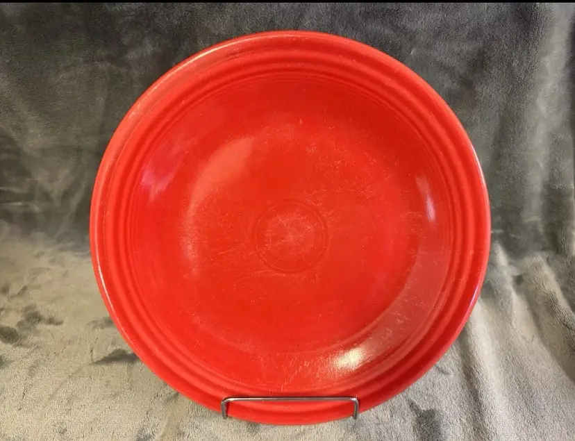 The Fiesta Fiestaware Classic Dinner Plate in Scarlet Red by Homer Laughlin is a vintage ceramic piece perfect for all occasions. Made in the United States with a glossy finish, this round dinner plate features a decorative pattern and vibrant red color. With a 10.5" diameter, this microwave and dishwasher safe plate weighs 2.2 lbs, making it a durable and stylish addition to your dinnerware collection. The Fiesta product line, known for its art pottery production style and technique, ensures quality and a timeless look for your table setting. Good condition. No chips or cracks; however, does have utensil scratching from use (see photos).