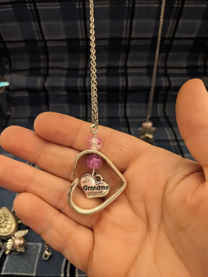 Made from silverplate silverware. I can customize up to the charm, beads, and the length of the chain. The pattern of silverware maybe random but open to requests and I'll see what I can do.