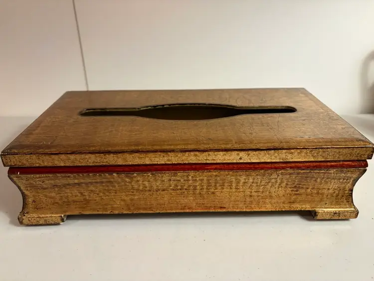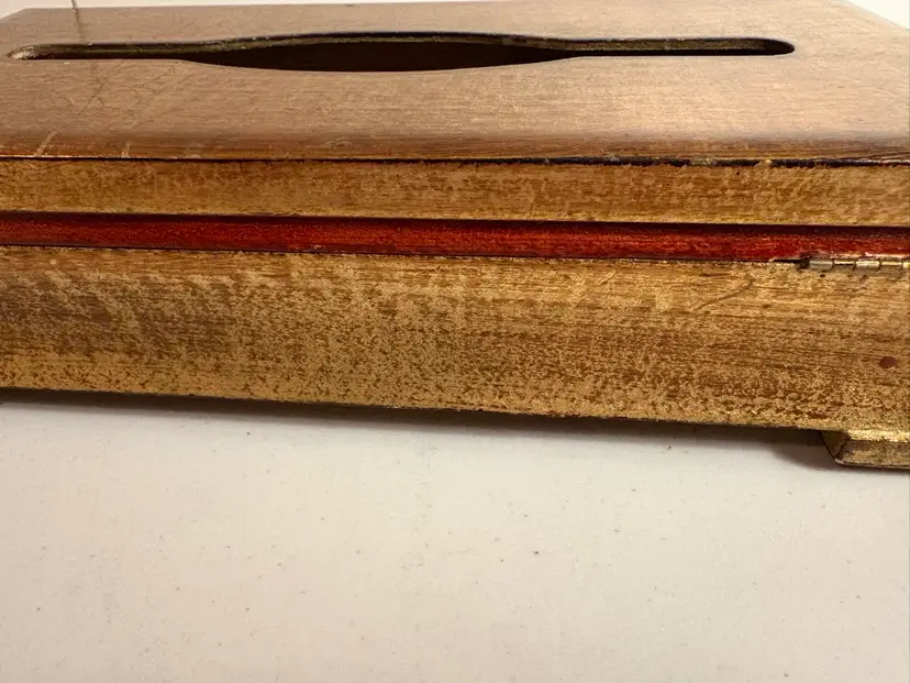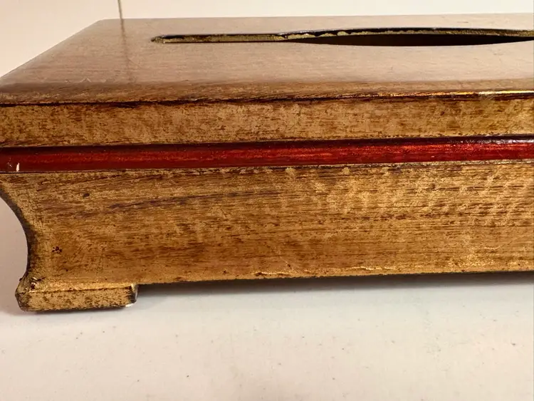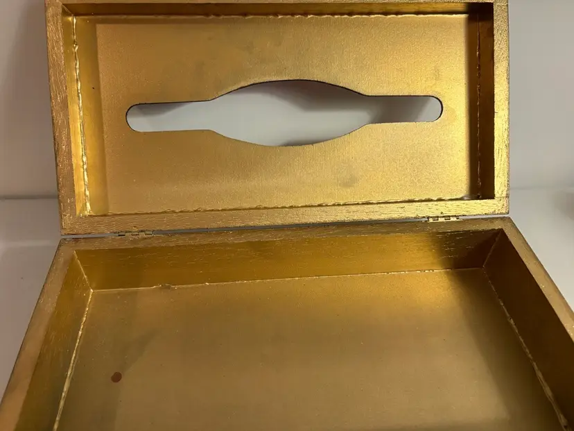Florentine wooden tissue box cover. These are handcrafted, often in Italy, and feature a gilt-gold finish and classic design. The item is a decorative cover designed to hold a standard rectangular tissue box. It is typically made of wood or a wood composite and is hand-painted with a gold leaf application for a distressed, antique appearance. The design often features a classic or "Hollywood Regency" style, intended to blend with traditional home decor.