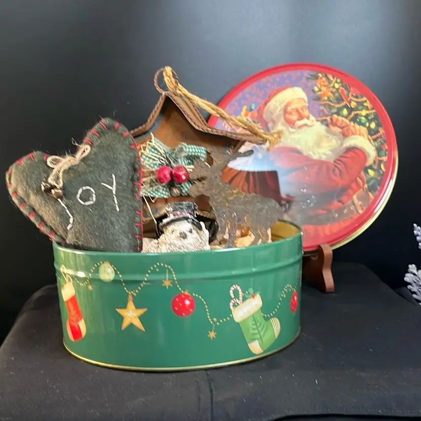 Will include upcycled Santa Christmas tin w/ lid, fabric ornament, small bird w/ top hat, metal cut out of a moose-All is in good vintage condition. Total pre shipping wt is approx 12 Oz