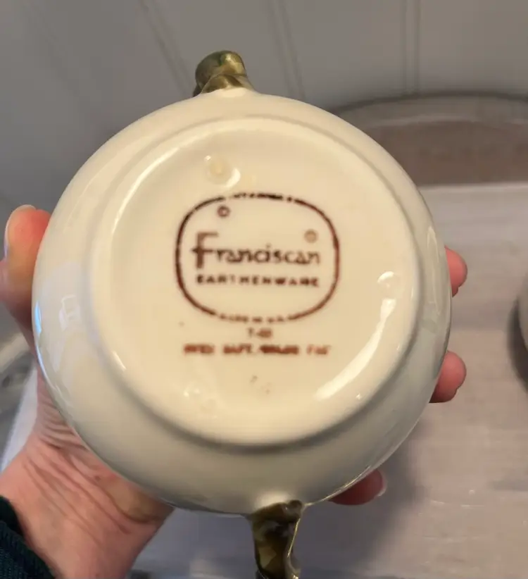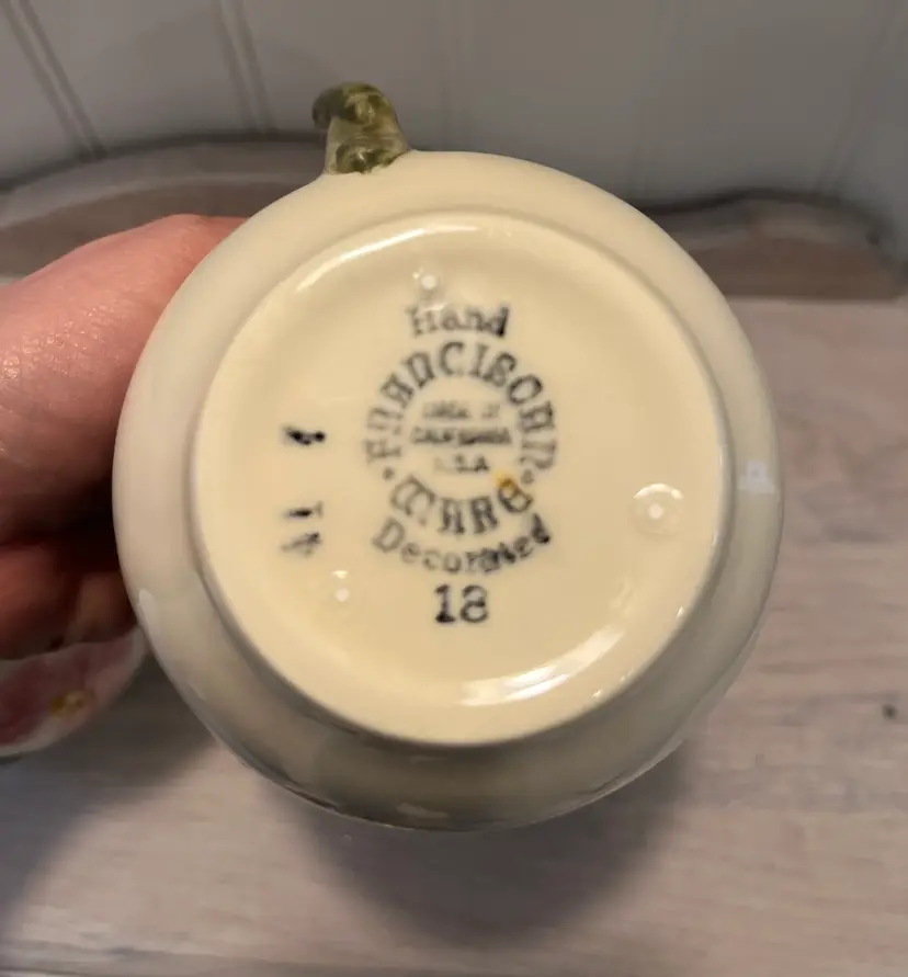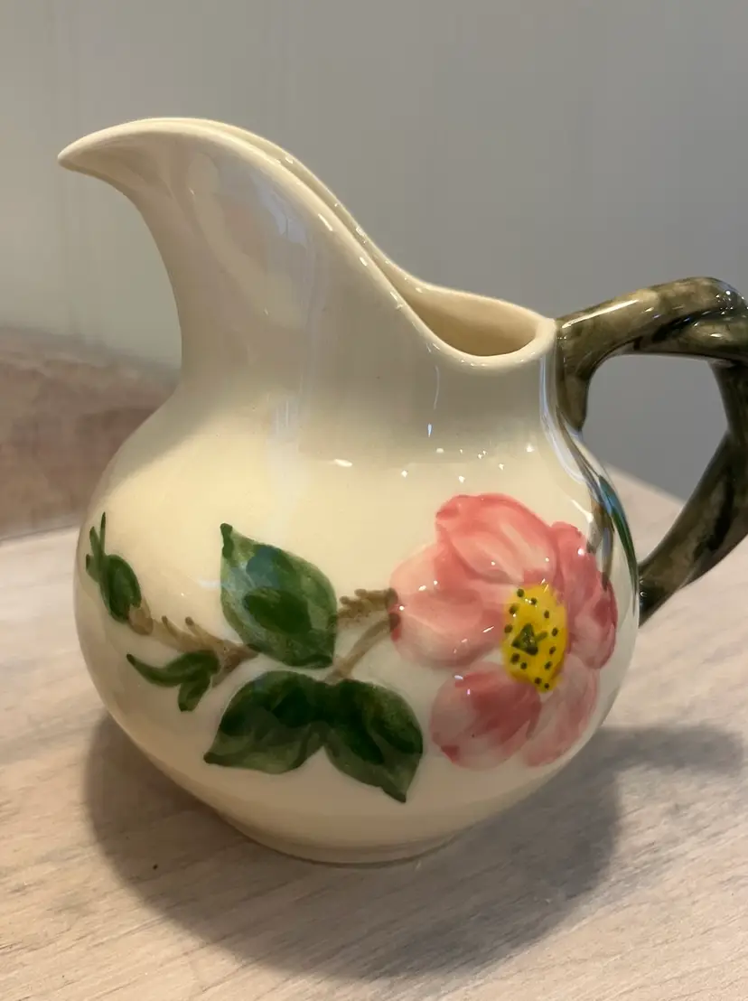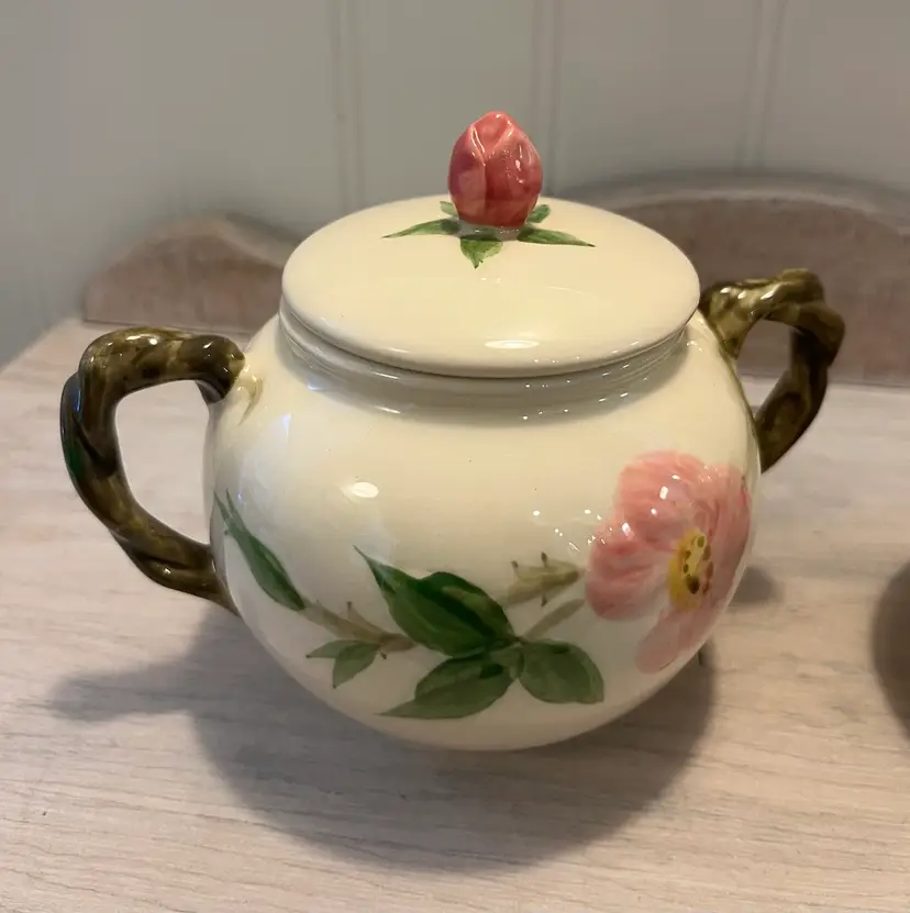 This is a vintage Franciscan Desert Rose creamer and sugar set. Features the classic, hand-painted pink floral "Desert Rose" pattern with green leaves and branch-like handles. The pattern was first manufactured in late 1941 in the USA and later made in England and Portugal.