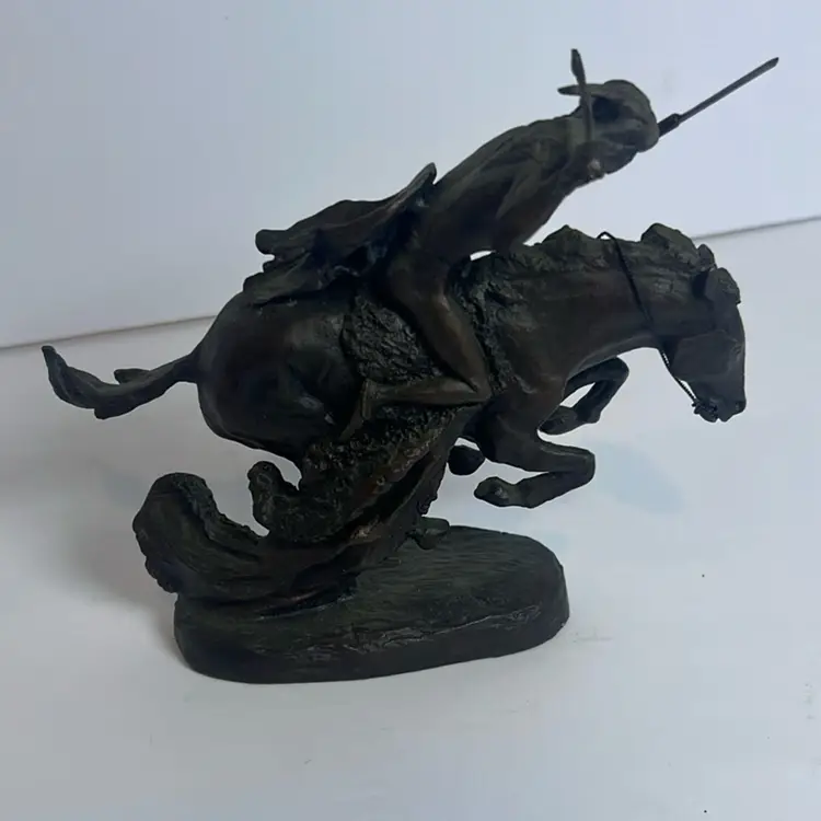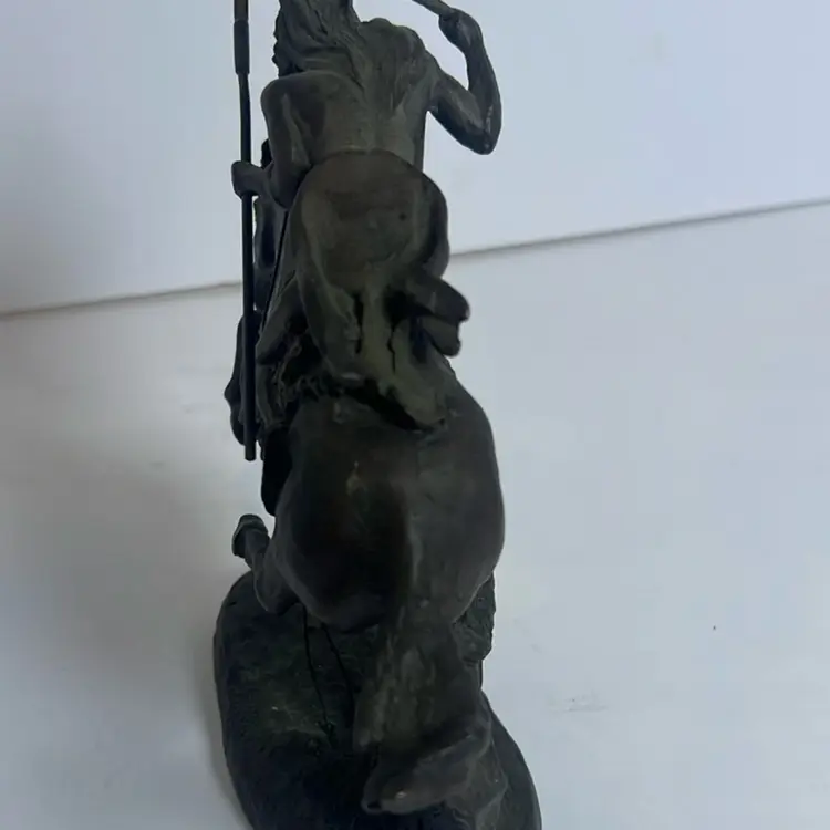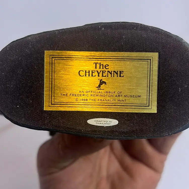 The "Vintage 1988 THE CHEYENNE Bronze Sculpture" is a small bronze statue depicting a Cheyenne Native American. Designed by Frederic Remington and produced in 1988, this licensed reproduction stands at 7 inches tall. The sculpture showcases Western and Indian themes, reflecting the culture and style of the Cheyenne people. Created through bronze casting, this piece captures the essence of the Cheyenne culture during the 1980s