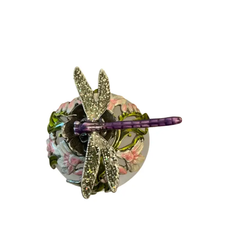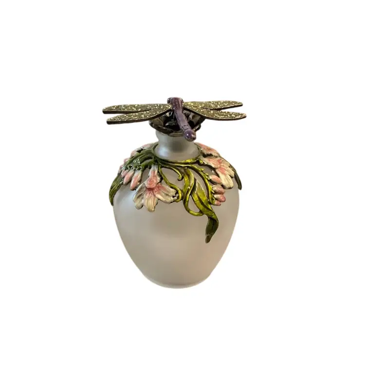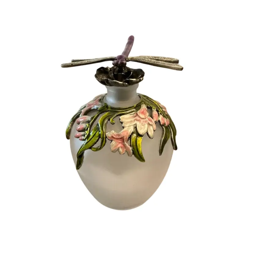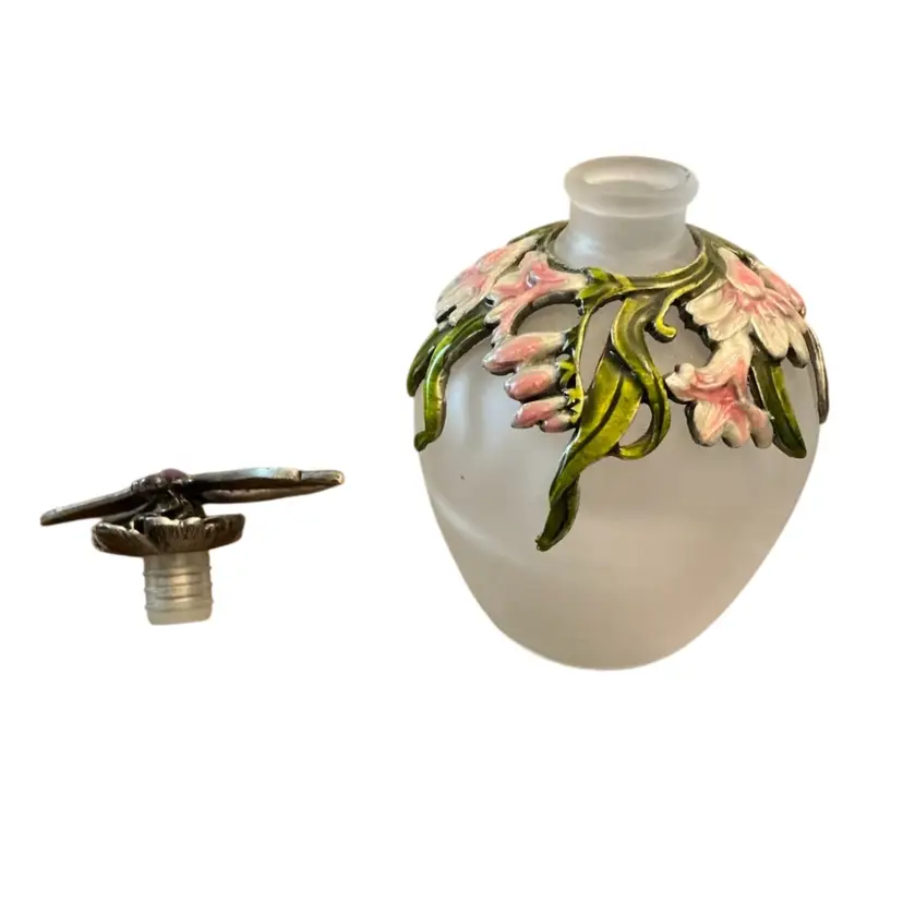 Gorgeous frosted glass bottle with enameled flowers and a metal dragonfly stopper.