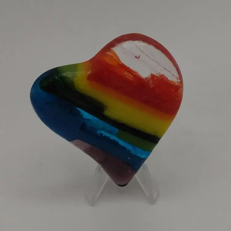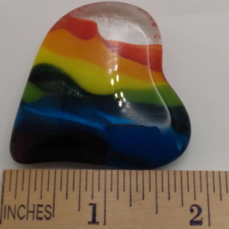 Small, fused glass heart, kiln made with love by me! Each heart is unique and varies in color placement, bubbles and depth of field. Shiny on the front, textured on the back, approximately 2 x 1 3/4-inches; weighs approximately 35 grams. Made with Bullseye glass.