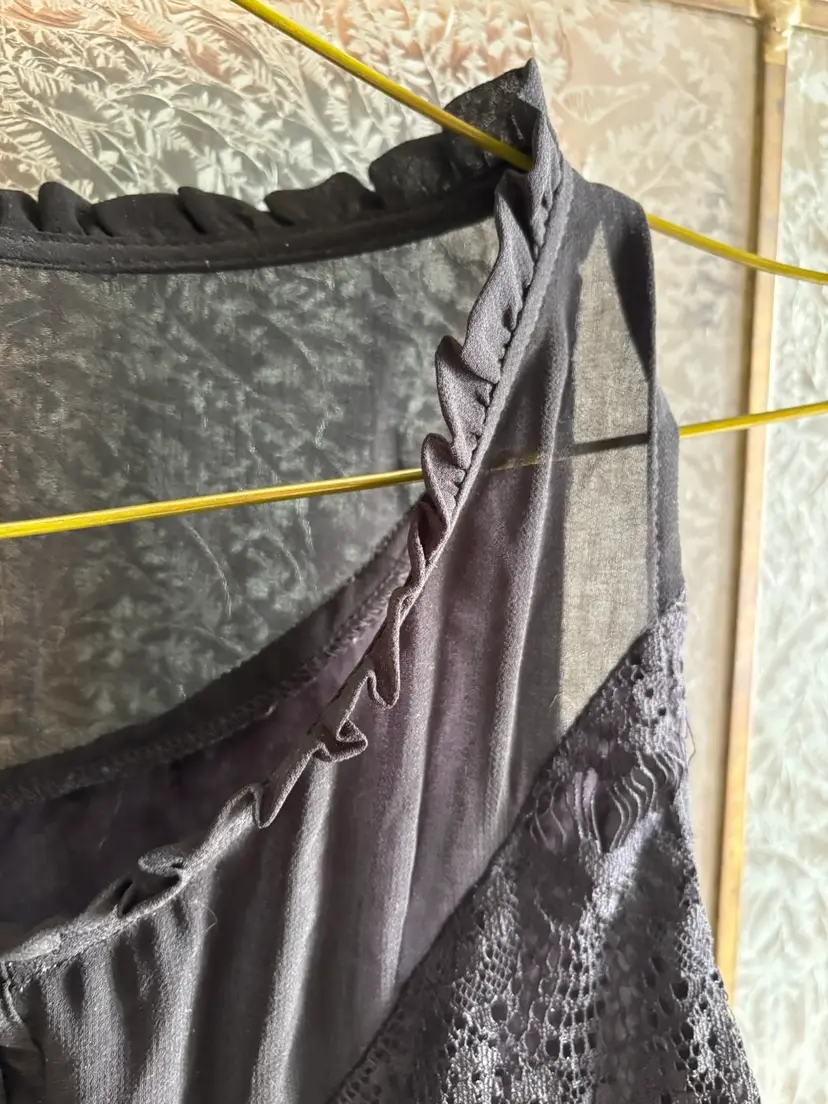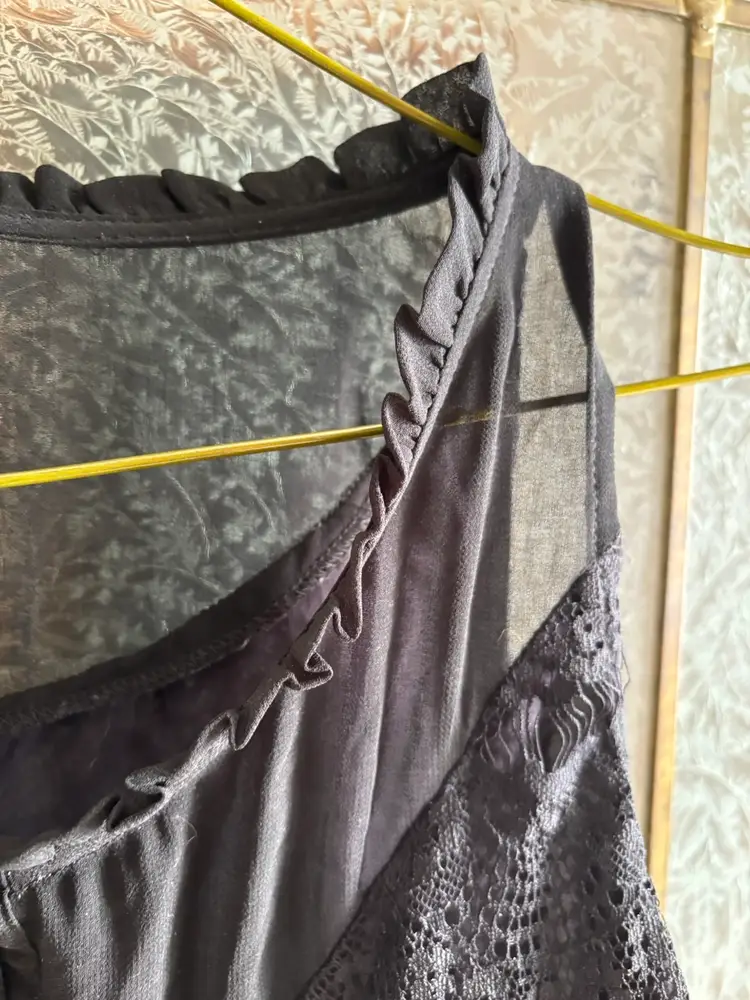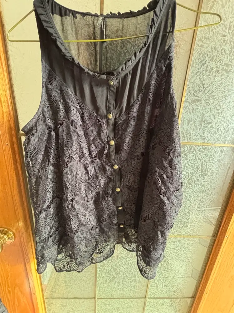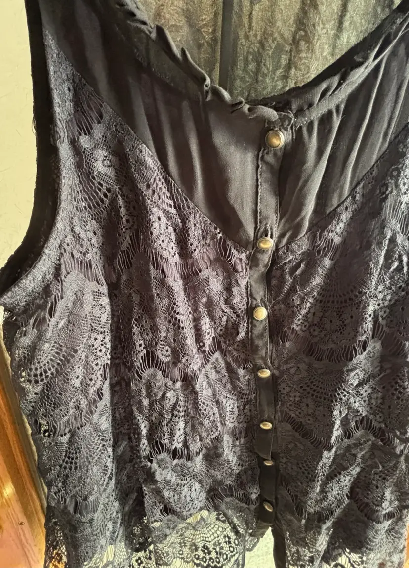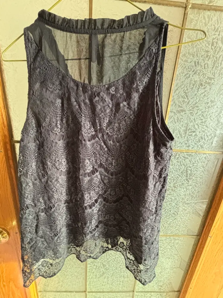 This elegant black lace sleeveless top is perfect for any occasion. Its intricate lace design adds a touch of sophistication to your wardrobe. Pair it with your favourite jeans or skirt for a chic look. 20” pit to pit.