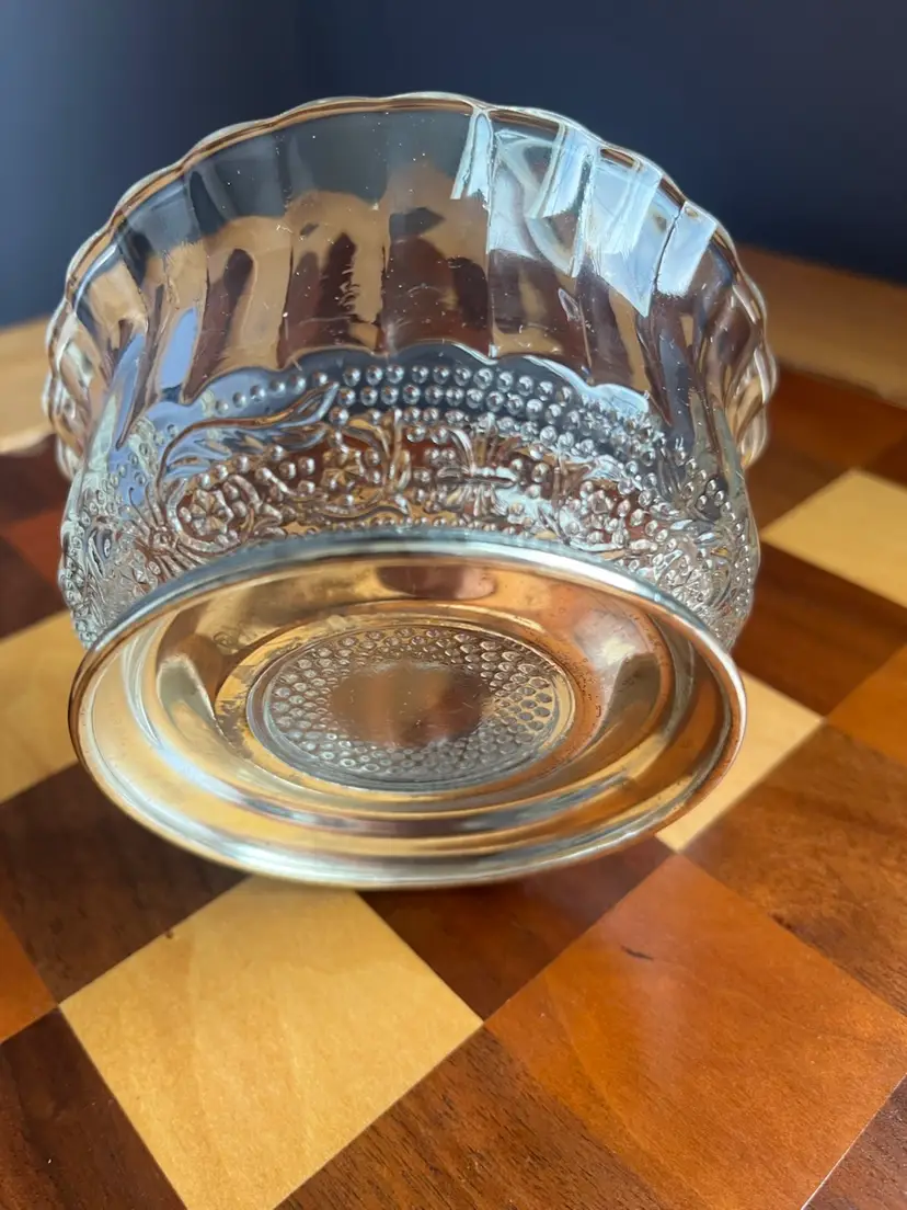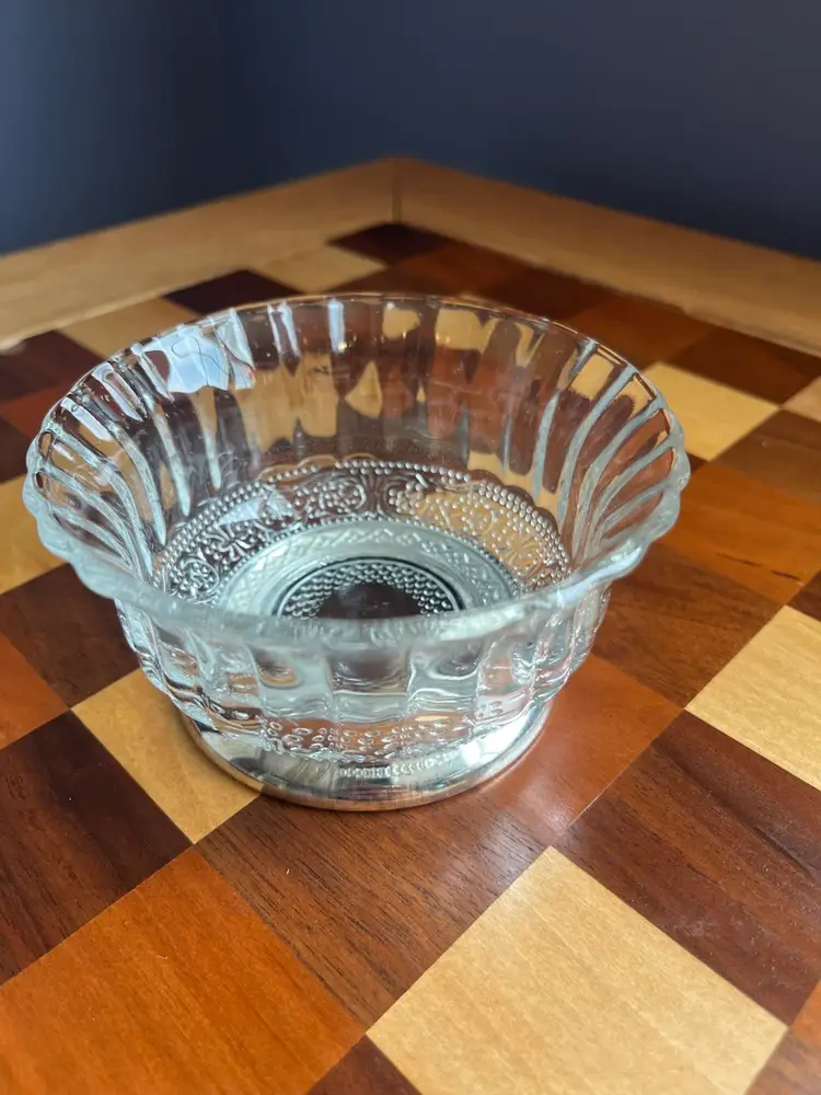 Genuine Crystal and silver plate pedestal bowl, inbox, collectors Crystal galleries by Fairfield 2 inches tall 4 inches wide