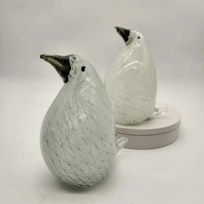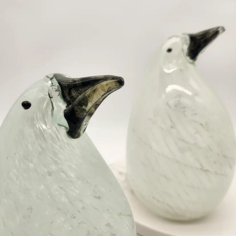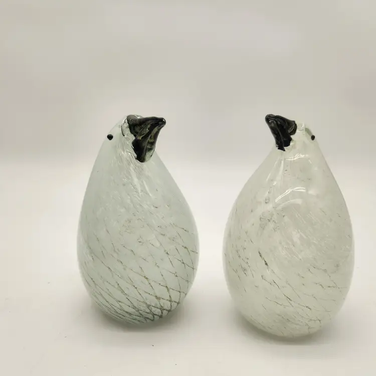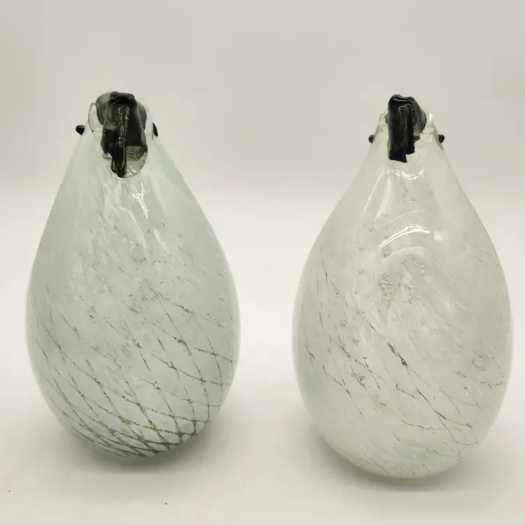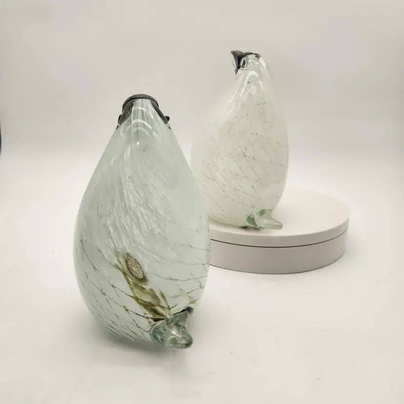 These cuties may be a mated pair: one has more dramatic coloring & is slightly larger than the other - just like in nature! Their maker is unknown, but they are hand blown using techniques inspired by Murano glass artists - if not actually made by Murano artists. They have hollow bellies that required swift & careful glass manipulation to achieve the form, including their tails, and the internal latticework also known as a drapery or filigrana technique. The black glass for their beaks & eyes was added after the bodies were completed but while the glass was still hot. Like New Condition: no chips, or cracks. Measurements: 6 3/4" tall, 12 3/4" round at their widest point, the more colorful one is 5 1/2" from tip of tail to front of belly, the other is 5 1/4" from tip of tail to front of belly