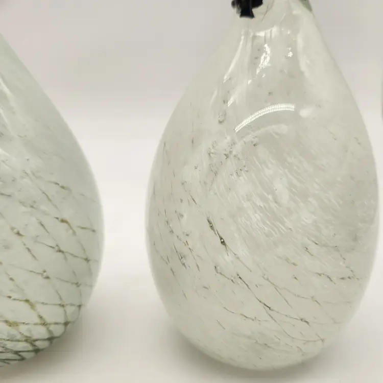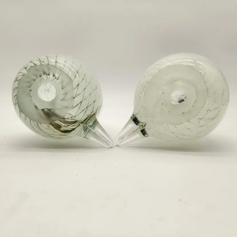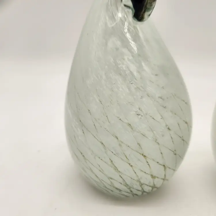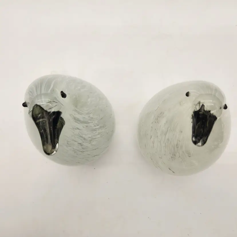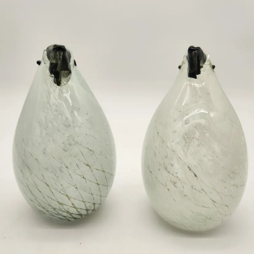 These cuties may be a mated pair: one has more dramatic coloring & is slightly larger than the other - just like in nature! Their maker is unknown, but they are hand blown using techniques inspired by Murano glass artists - if not actually made by Murano artists. They have hollow bellies that required swift & careful glass manipulation to achieve the form, including their tails, and the internal latticework also known as a drapery or filigrana technique. The black glass for their beaks & eyes was added after the bodies were completed but while the glass was still hot. Like New Condition: no chips, or cracks. Measurements: 6 3/4" tall, 12 3/4" round at their widest point, the more colorful one is 5 1/2" from tip of tail to front of belly, the other is 5 1/4" from tip of tail to front of belly