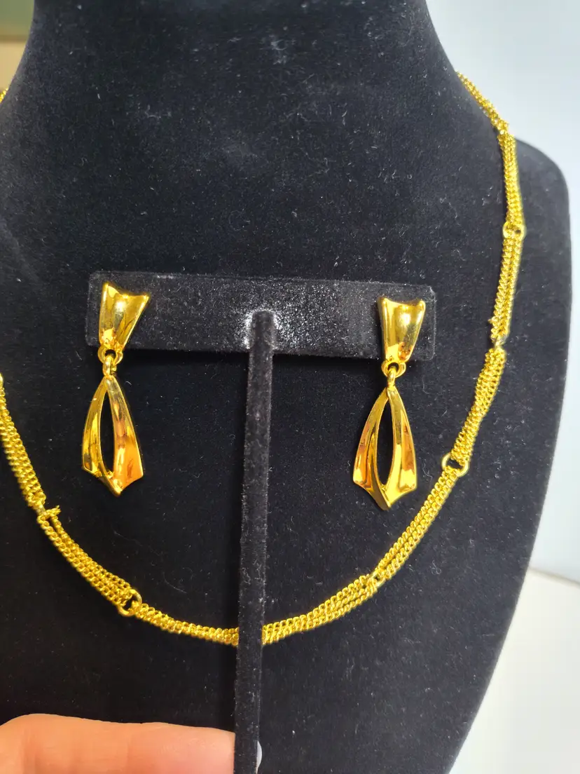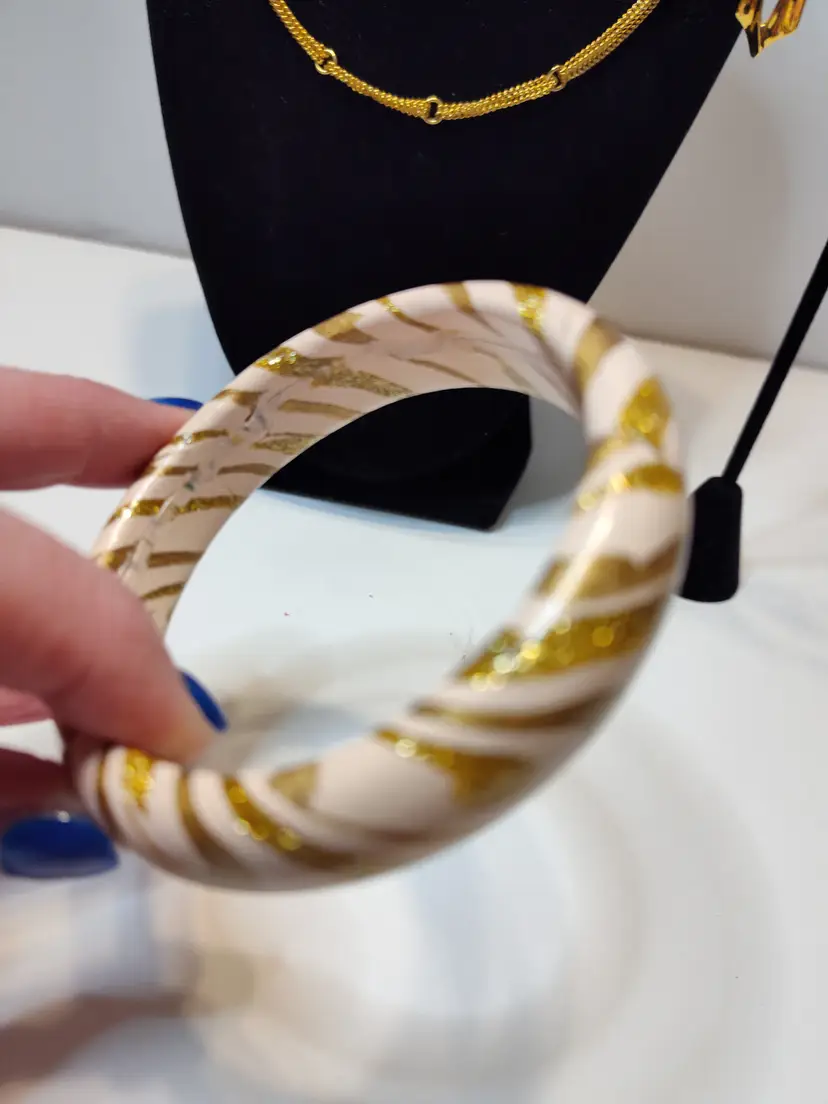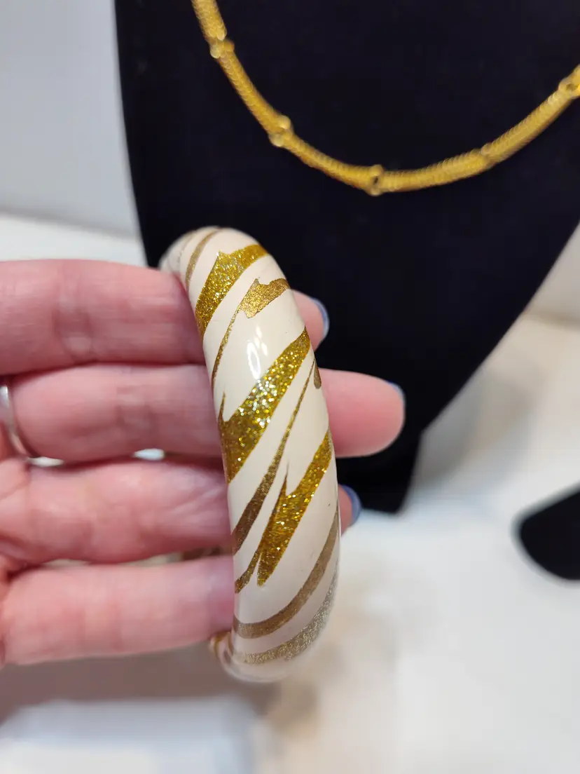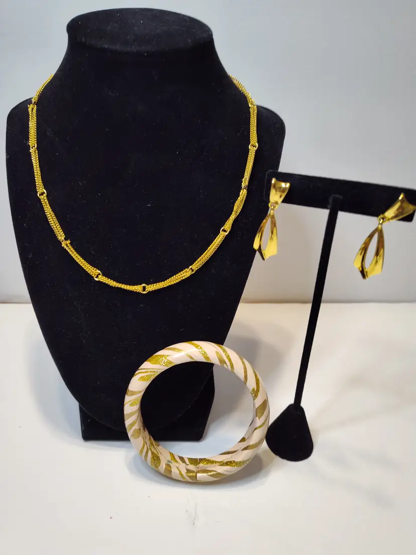 16" Gold tone necklace with spring ring clasp, 2.5" pink & gold glitter bangel bracelet and 1.5" gold tone vintage Napier post earrings