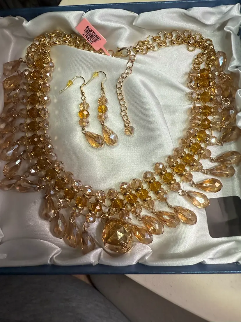 Details: • Set Includes: Necklace and matching earrings • Material: Faceted glass crystals, gold-tone metal • Color: Champagne gold and amber • Design: Bib-style with cascading teardrops and round faceted centerpiece • Closure: Lobster clasp with extender chain • Condition: Excellent, new with tag (acquired from a jewelers estate collection)