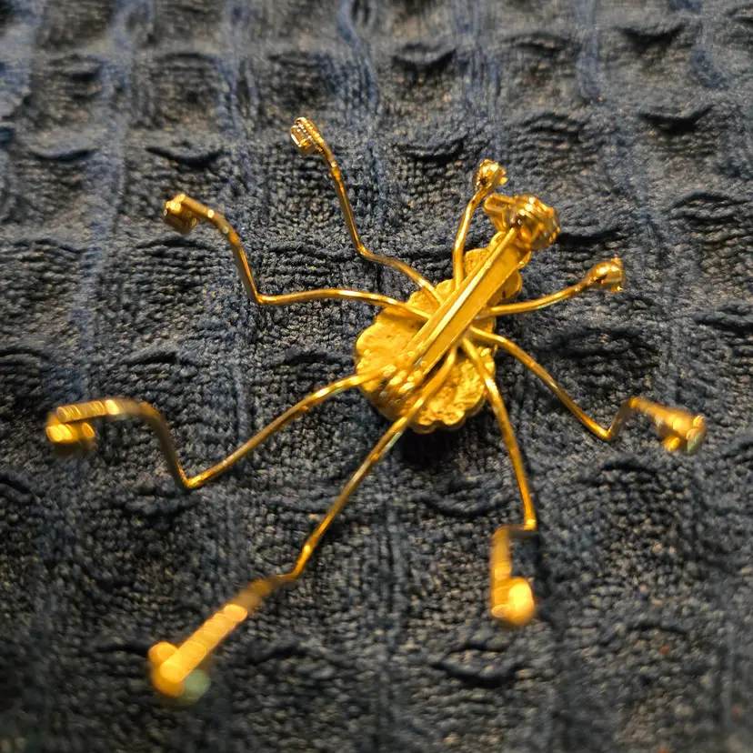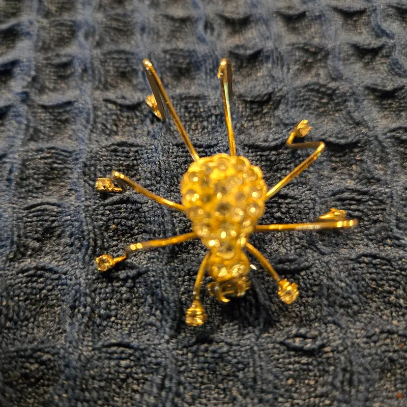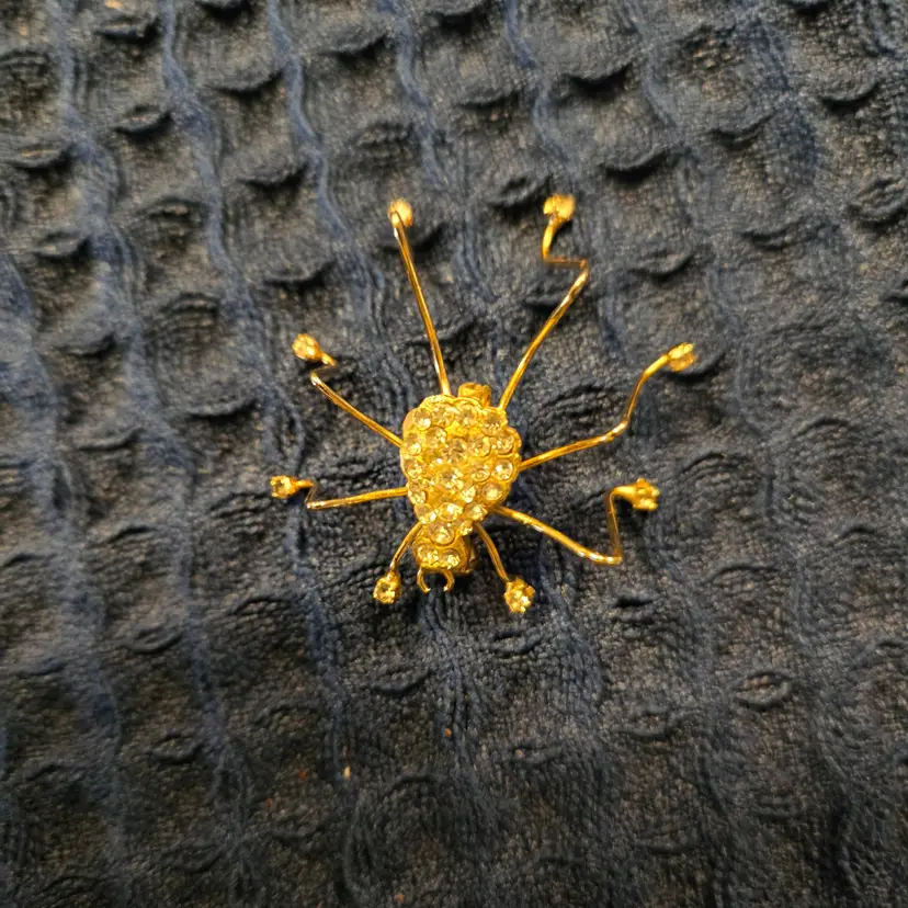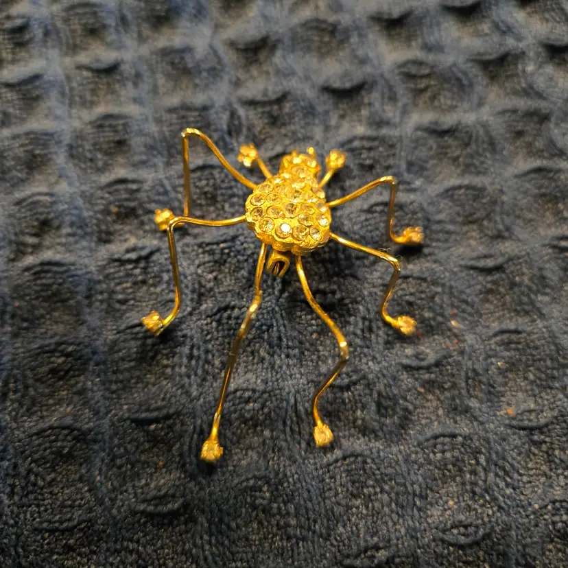 Vintage gold-tone spider brooch featuring clear rhinestones set in the body and on the ends of each leg. Nice working pin on the back. All the rhinestones are intact. Good condition. Unmarked
