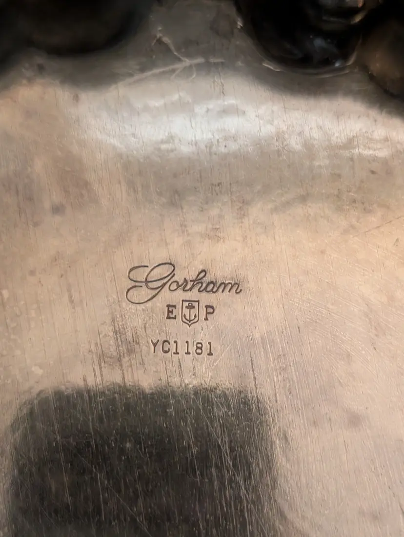 This exquisite Gorham Silver Plate Round Seashell Footed Tray is a stunning addition to any home decor. Its elegant seashell design and intricate craftsmanship make it perfect for special occasions or everyday use.
