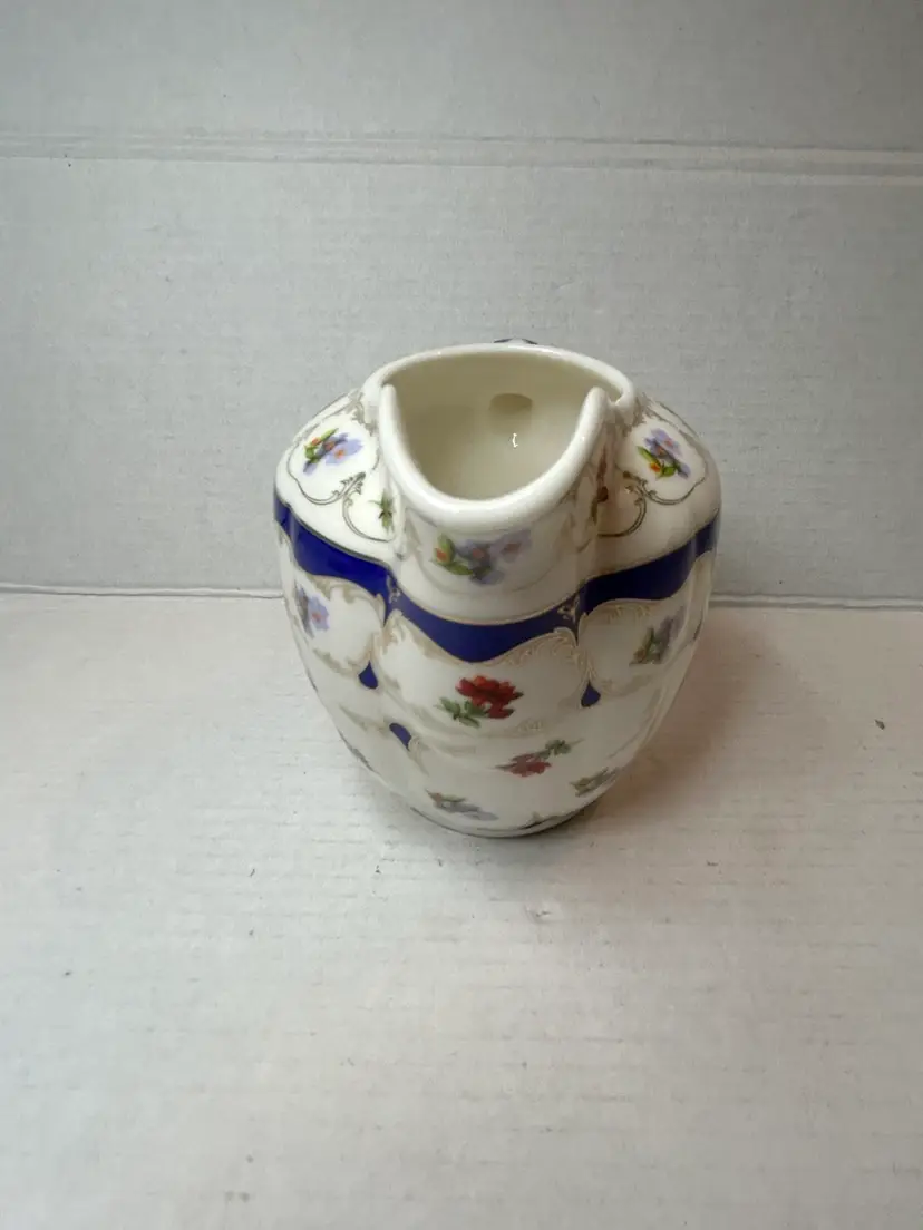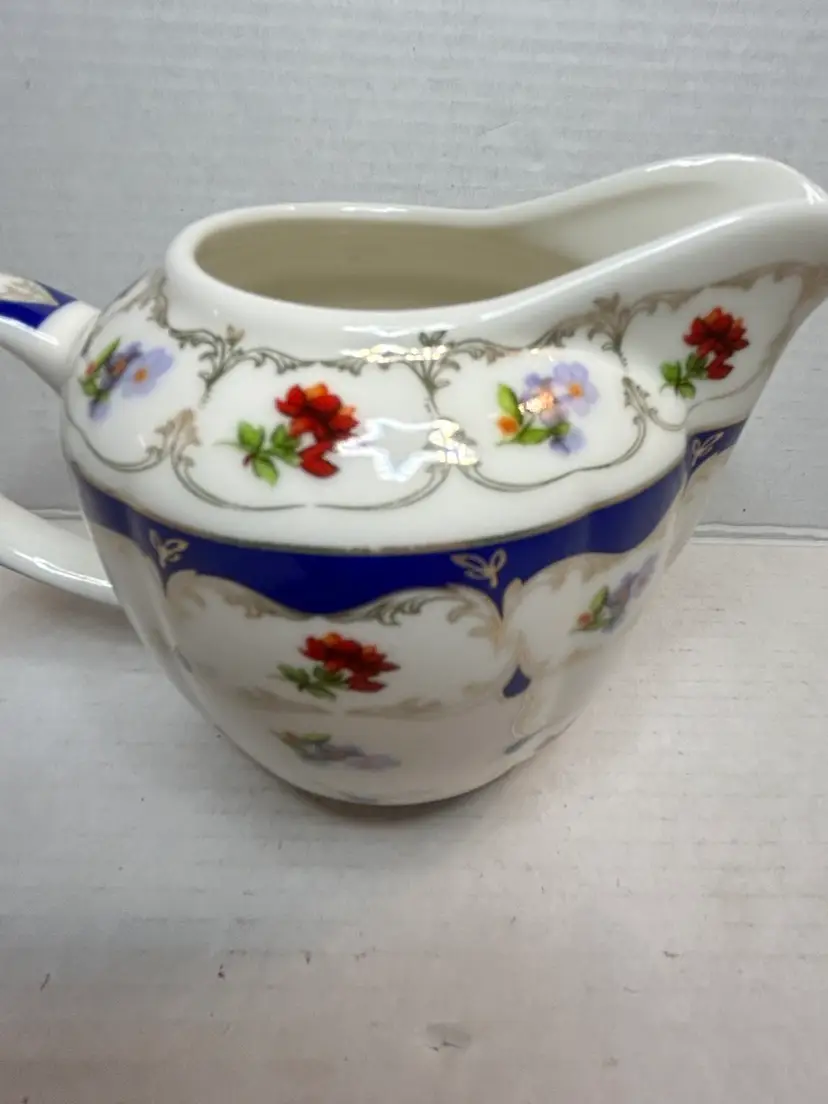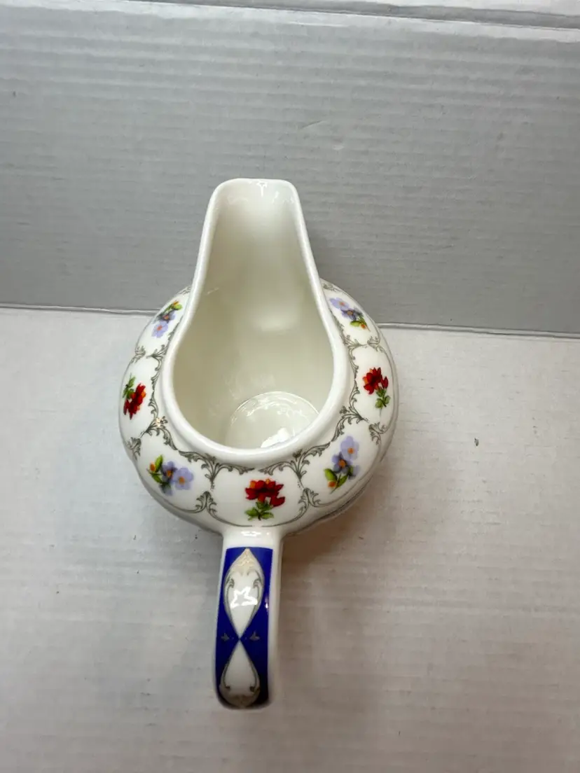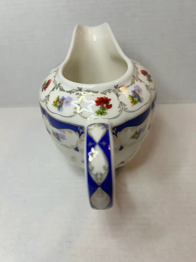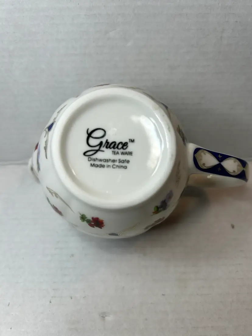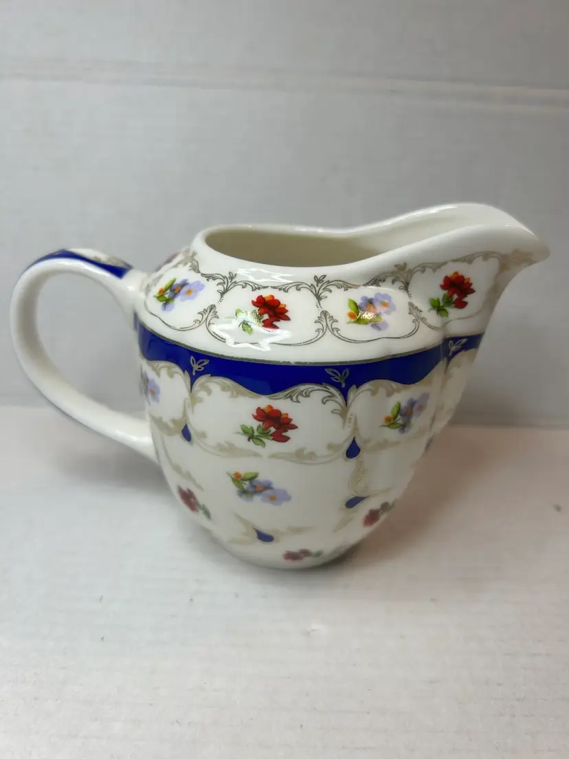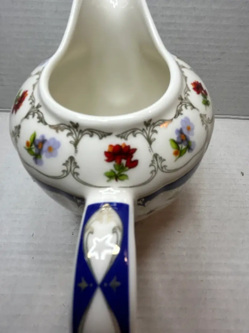 The Grace's Teaware Porcelain Creamer in Blue Floral Design with Gold Trim is a beautiful piece featuring a delicate floral pattern in pink and blue flowers. Made of white porcelain with a glossy finish, this creamer is both dishwasher safe for easy cleaning and imported from China. The brand, Grace's Teaware, ensures high quality and stylish design for serving cream in a charming and elegant manner. Perfect for adding a touch of floral theme to your tea or coffee service collection.