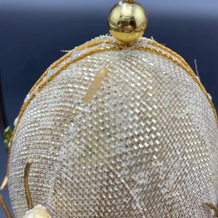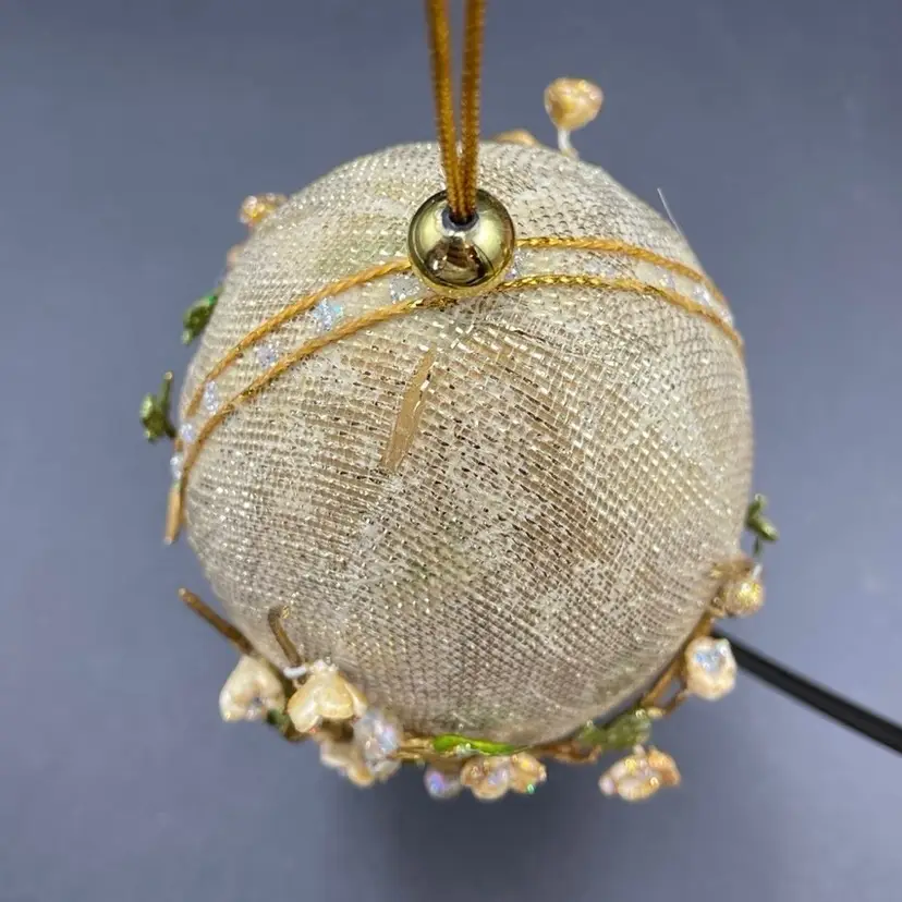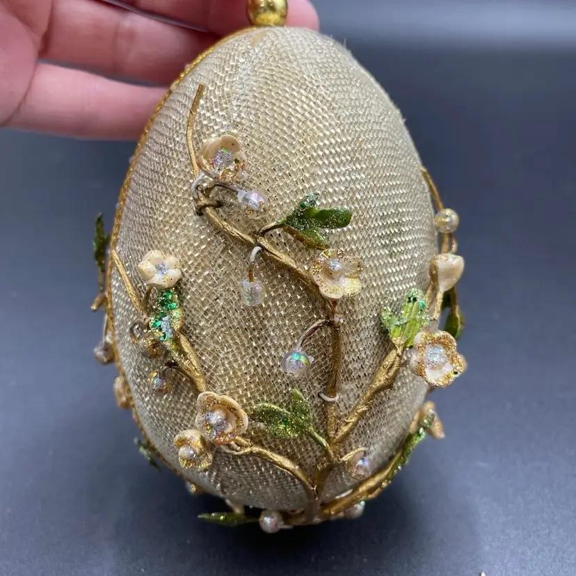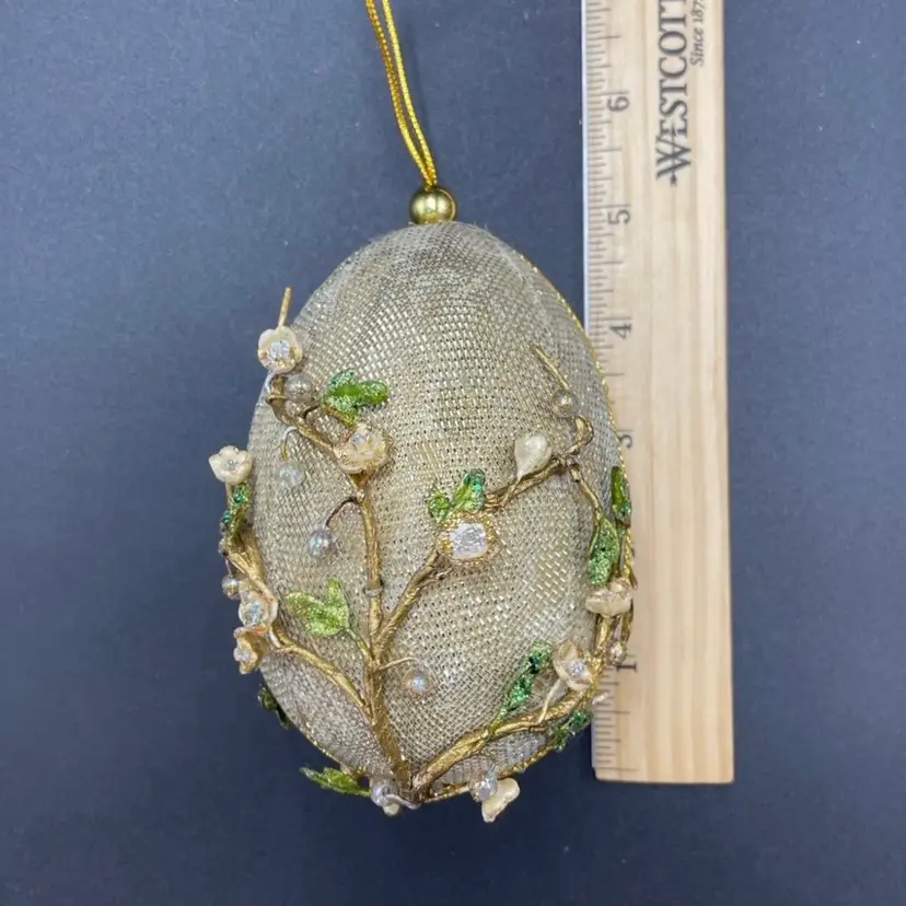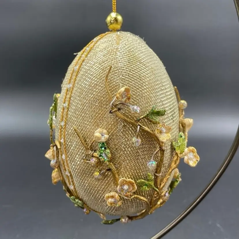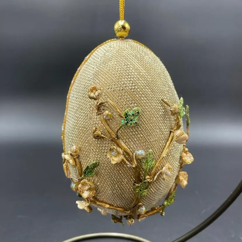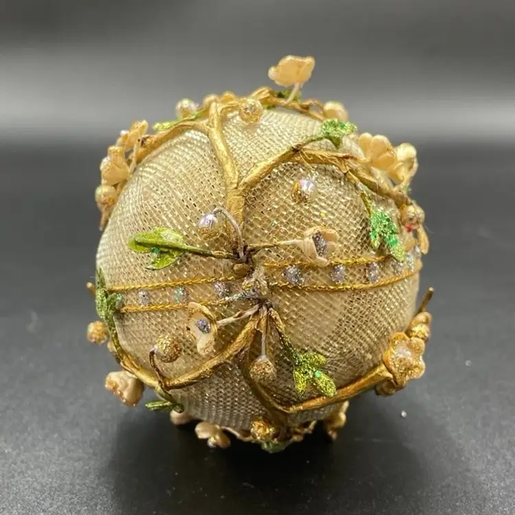 This is vintage handcrafted Gump's of San Francisco egg shaped hanging ornament featuring beaded cherry blossoms on an overlay of gold mesh. Measures approximately 5" long. There is one spot of wear at the top of the ornament as shown in photos. No other major flaws. Smoke free home.
