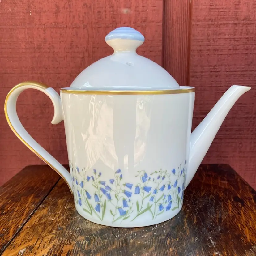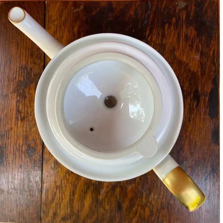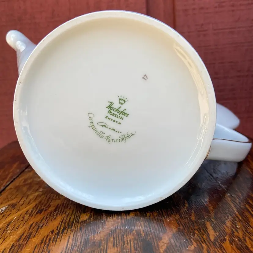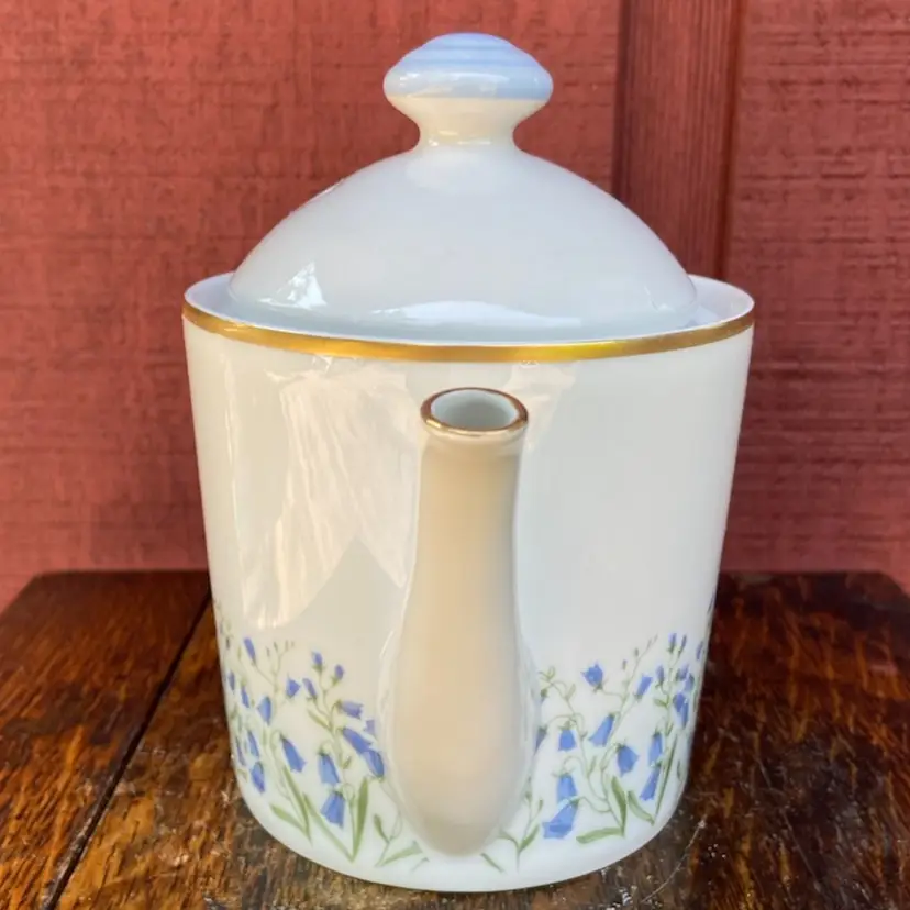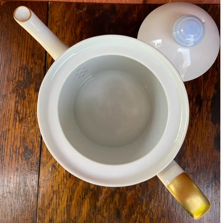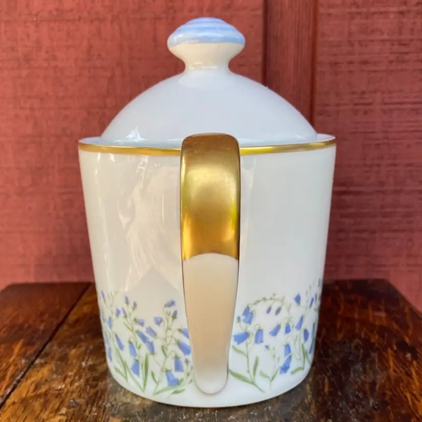 Approx 7”h x 9.25”l (including handle) x 4.75w. Preowned condition. No chips or cracks. Gold gilt in excellent condition. See images as part of description.